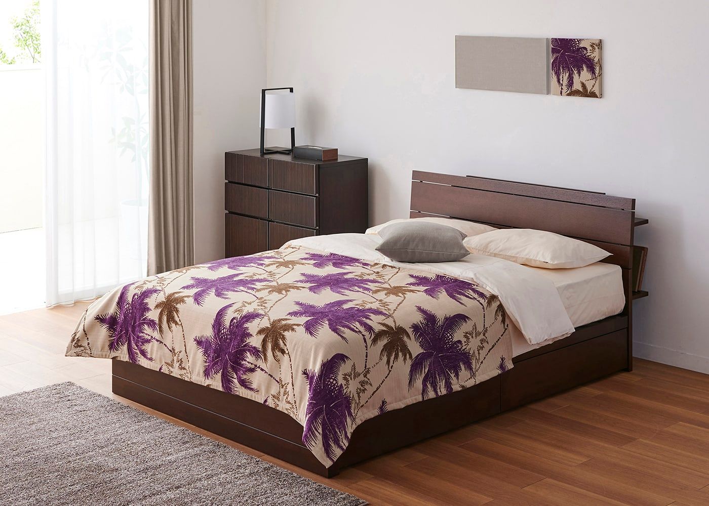 ベッドスプレッド (パーム)を主役にしたコーディネートは無限に存在します。多彩なインテリアアイテムと合わせて、自分だけの理想的な寝室を叶えてみましょう。(写真はベッドスプレッド 奥行1300 PRパープルと、ベッドスロー 奥行300 CLブラウンオークのセット例)≫ベッドスプレッド&スロー セットの一覧を見る