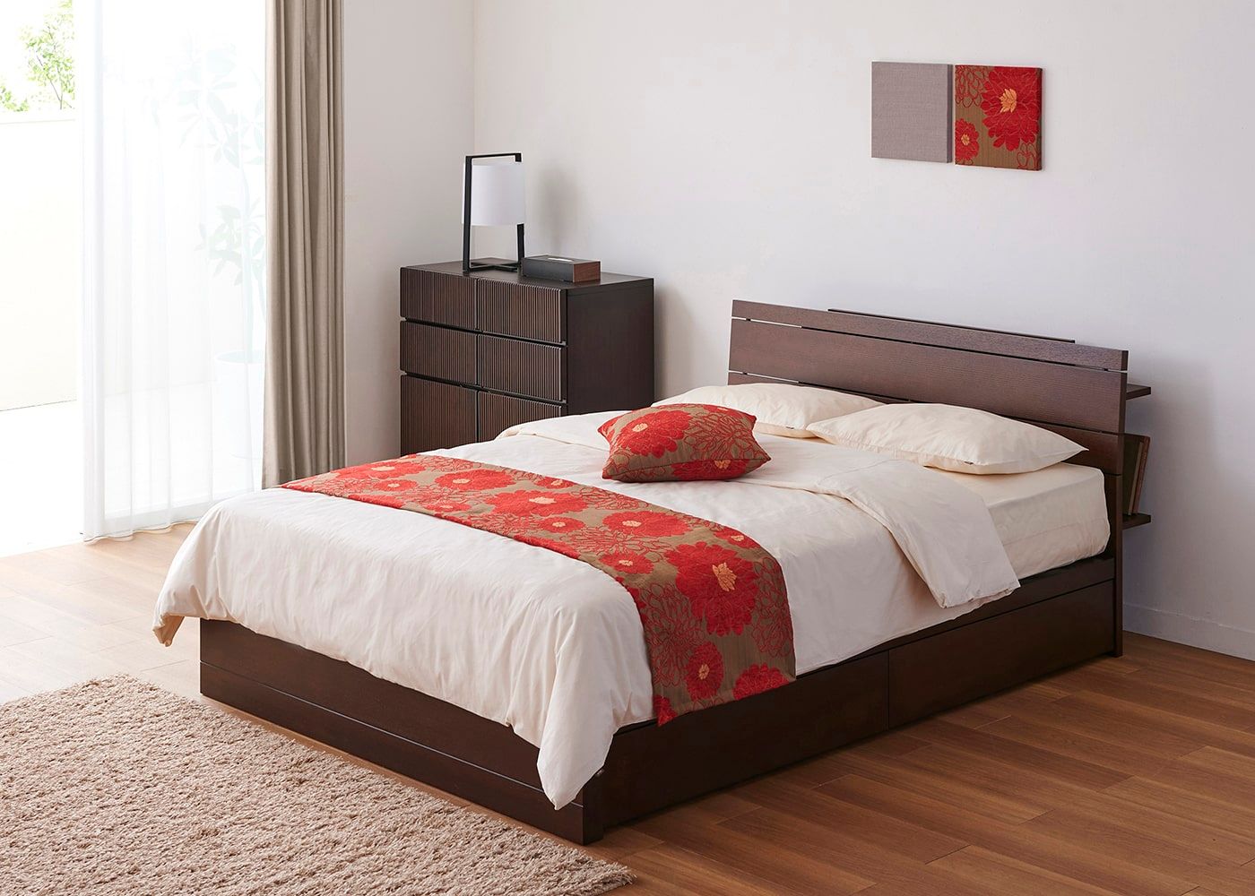 CLブラウンオークと、ベッドスロー 奥行300 PUレッドのセット例。