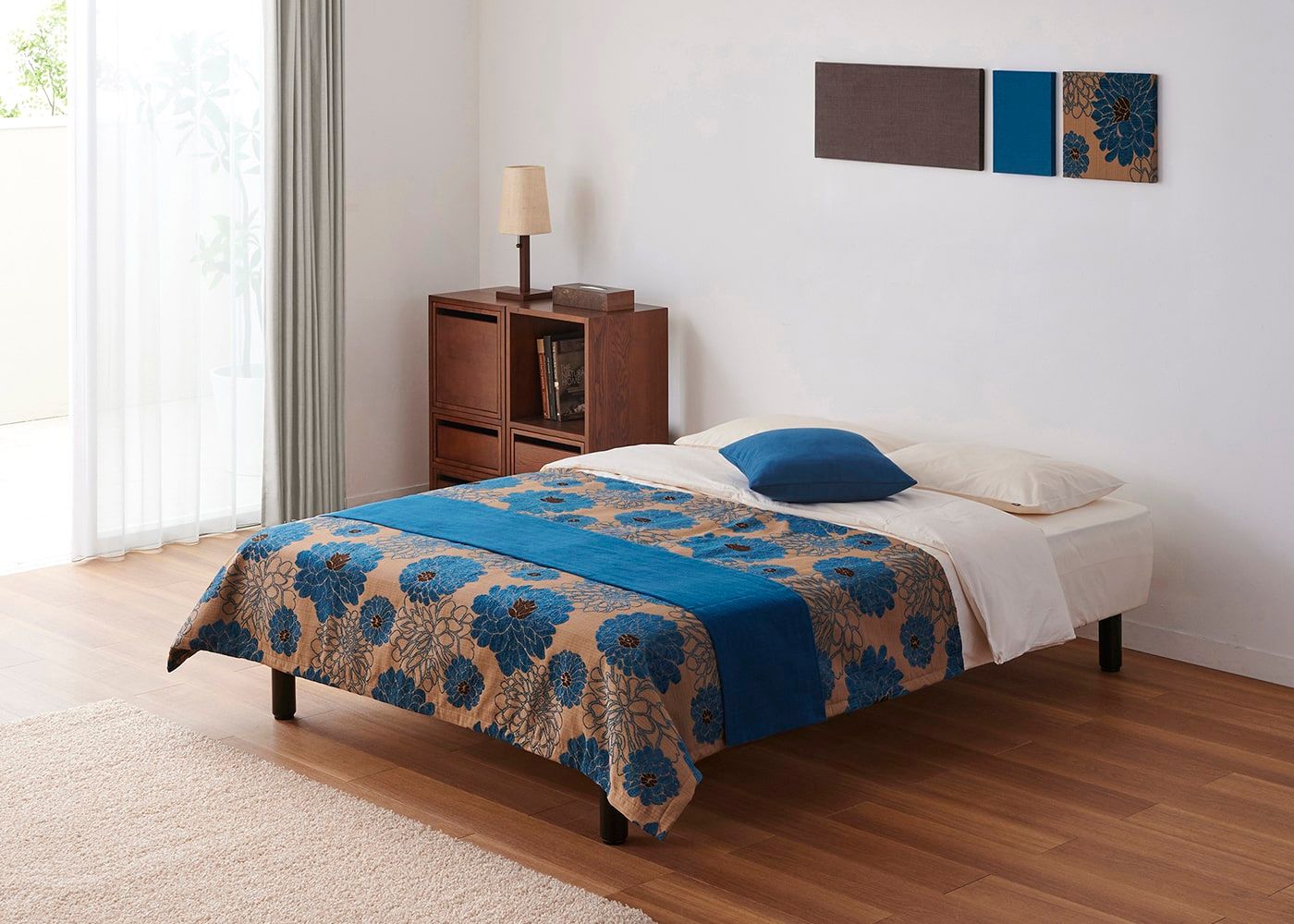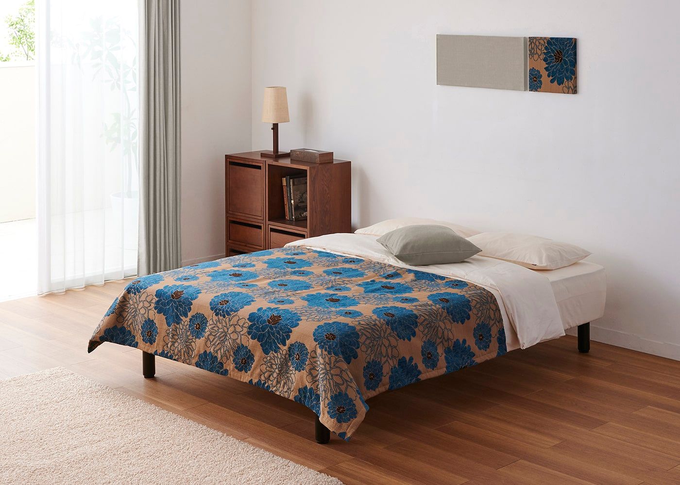 「菊」をモチーフにしたデザインが魅力のベッドスプレッド (パウリナ)。6色のバリエーションで、鮮やかさと落ち着きのある色合いをお楽しみいただけます。(写真はダブル・奥行1300 PUブルー)