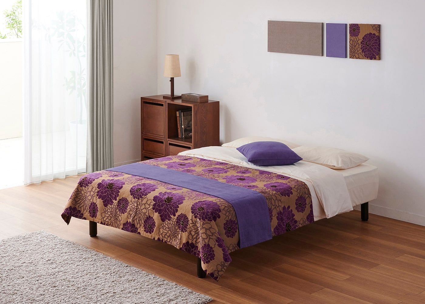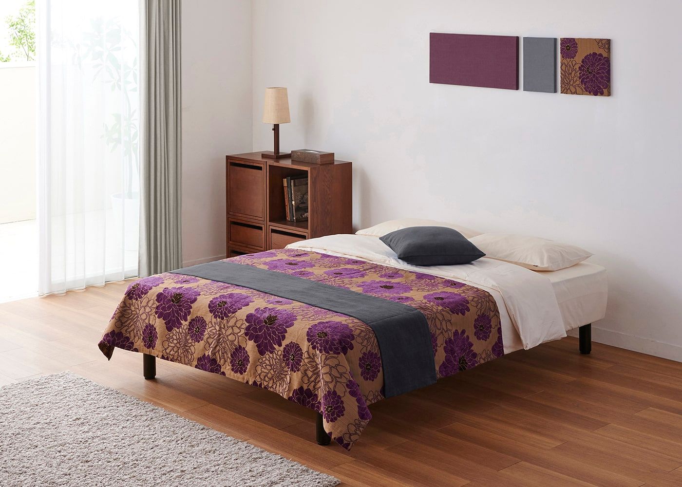 神秘的なパープルが特別感のある空間を演出する「フラワーパープル・スタイル」のコーディネート例。艶やかな紫色のクッションカバーをベッド上に加えれば、異国情緒なムードが漂う寝室を楽しめます。(写真はPUパープル。クッションは左から、CLグレープORパープル≫このコーディネート例の詳細はこちら