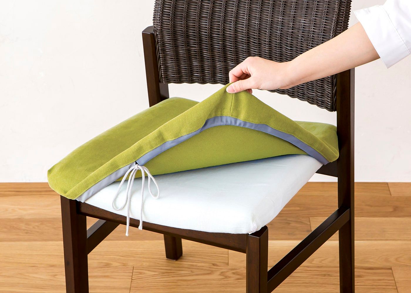 座面にカバーを被せて紐で固定するだけで、簡単にカバー交換ができます。