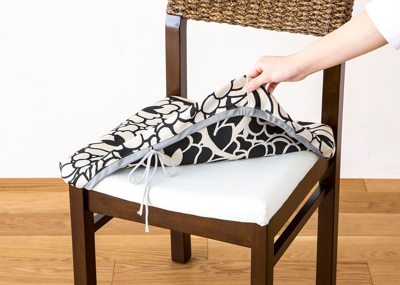 座面にカバーを被せて紐で固定するだけで、簡単にカバー交換ができます。[注]紐の仕様変更につき、在庫状況によってお届けするカバーの仕様が異なりますのでご了承ください。