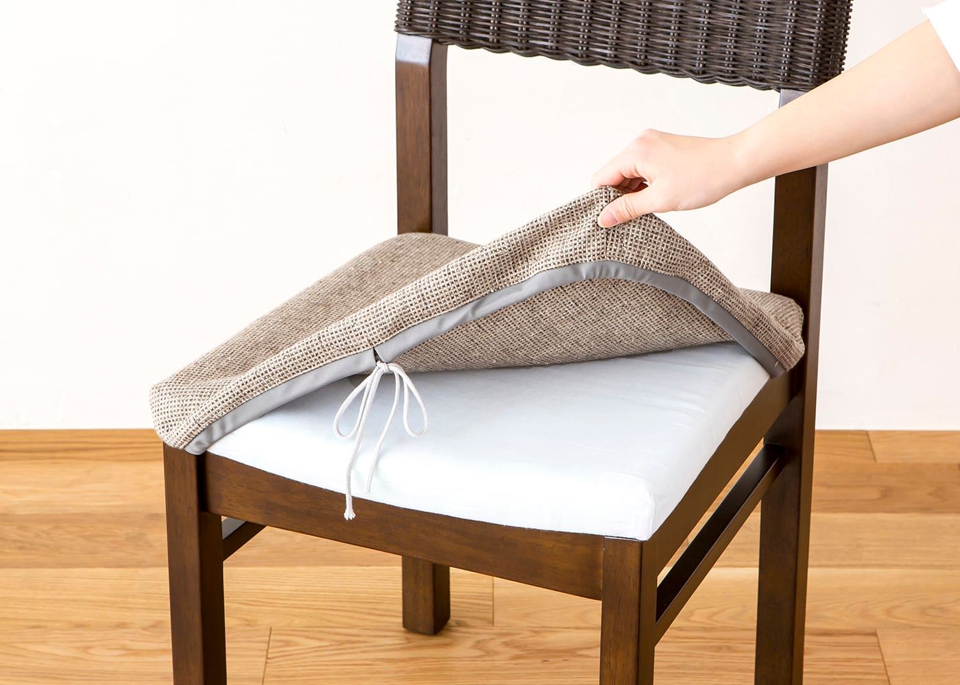 座面にカバーを被せて紐で固定するだけで、簡単にカバー交換ができます。