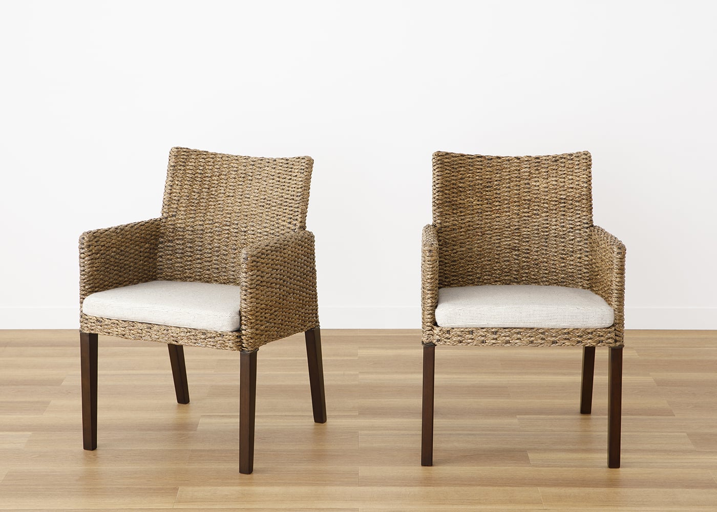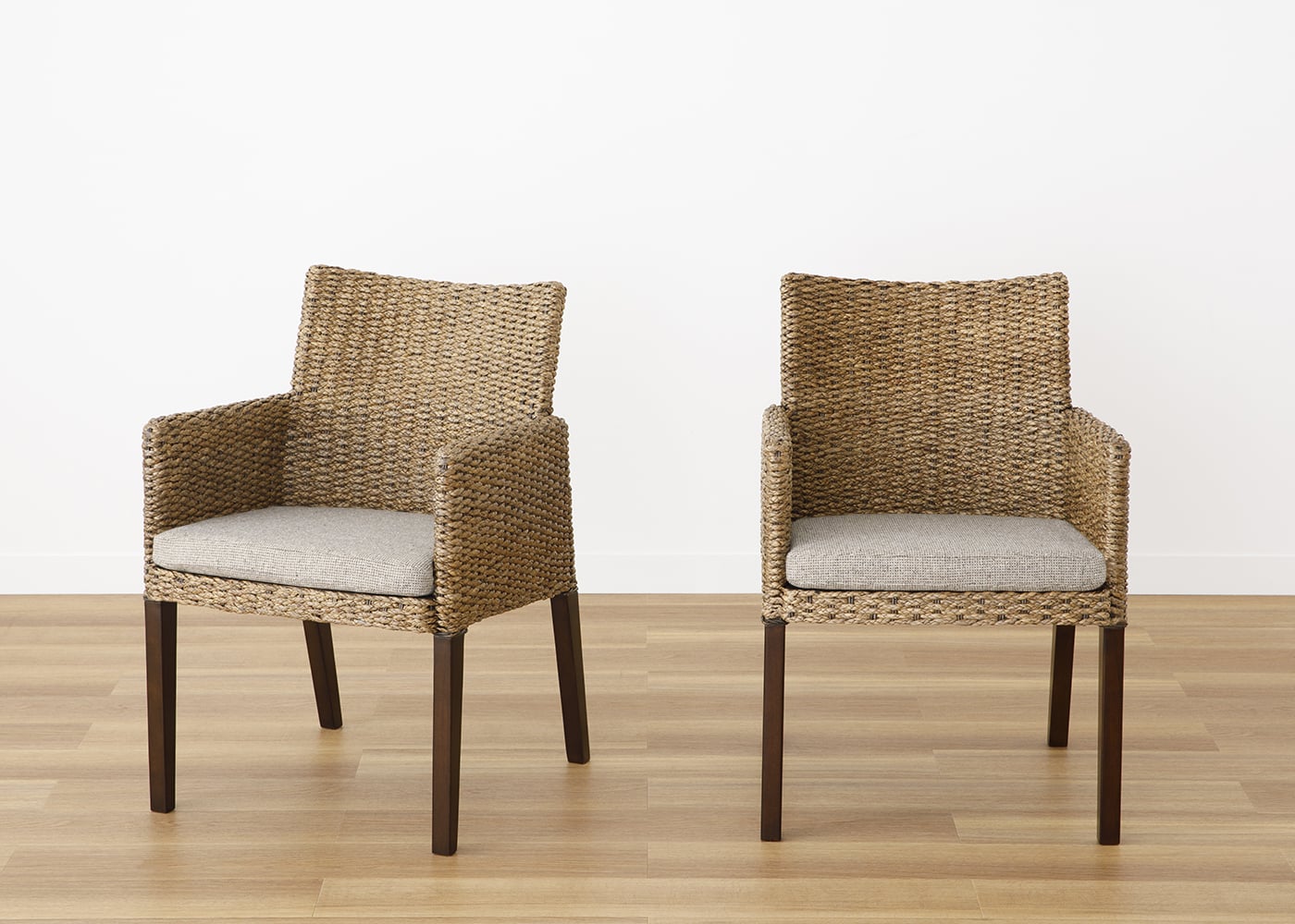 複数の糸で織り上げることで独自の素材感を生み出した日本製のファブリックであるムン・ダイニングアームチェア (ヒヤシンス) カバー (プラノ)。温かみのある3色からお好きな色をお選びください。(写真はPLダークベージュ。椅子1脚分のカバー販売となります)