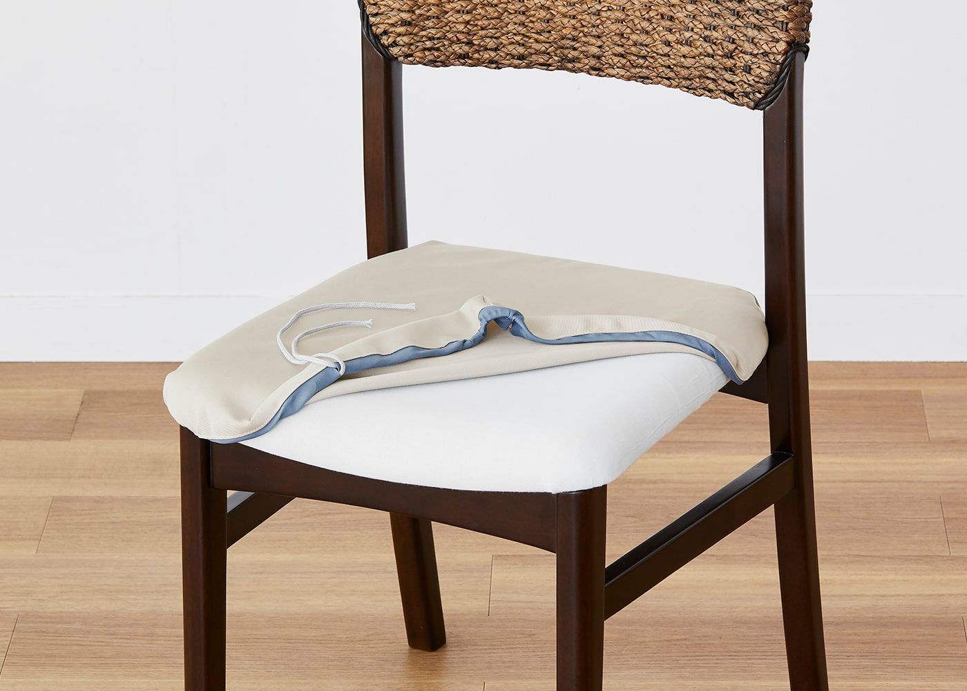 座面にカバーを被せて紐で固定するだけで、簡単にカバー交換ができます。
