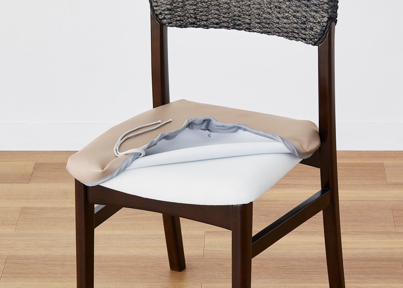 座面にカバーを被せて紐で固定するだけで、簡単にカバー交換ができます。