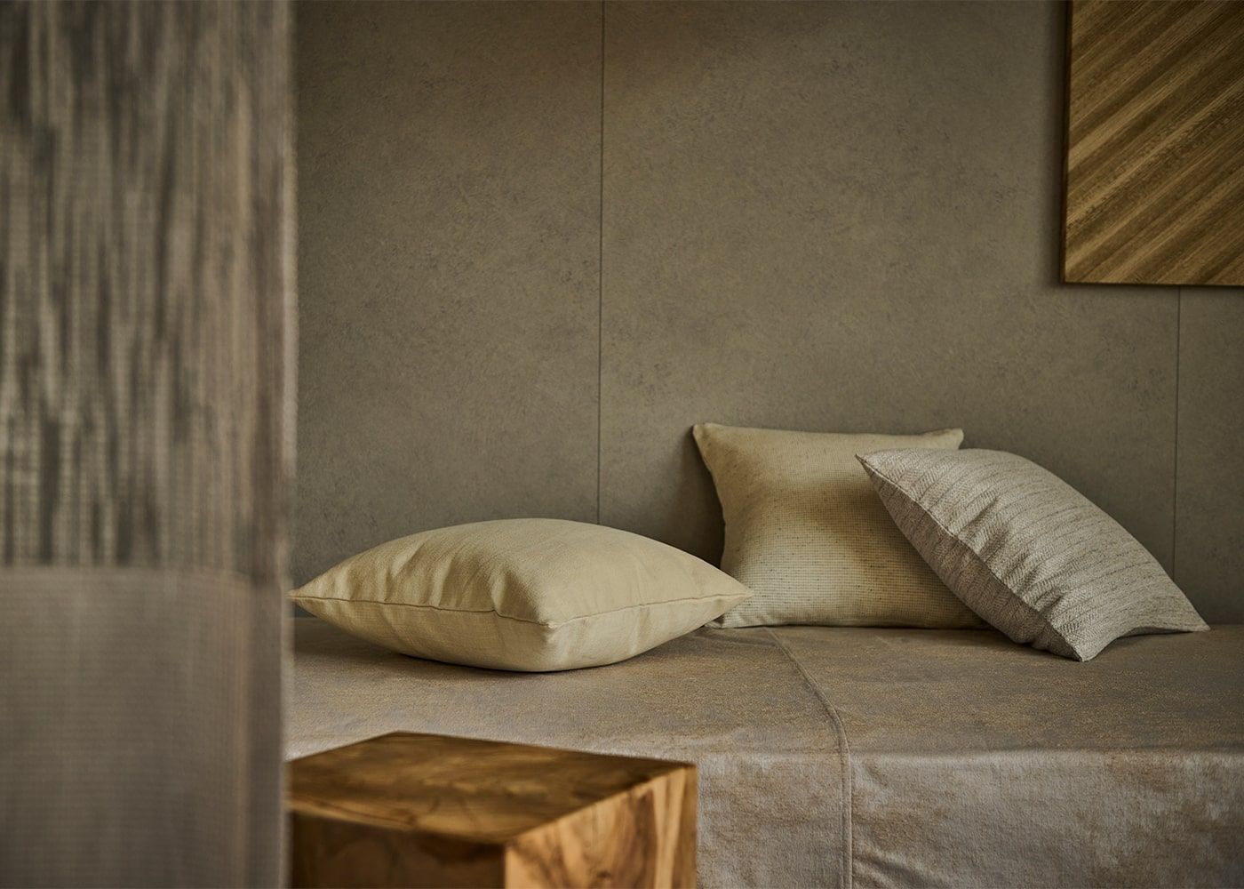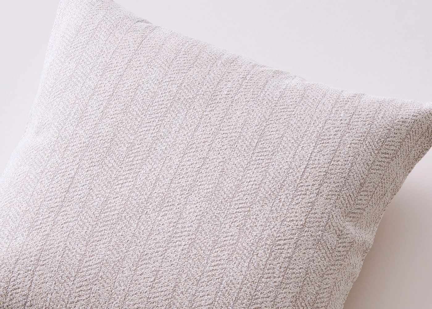 ニュアンスのある不均等なヘリンボーン柄がやさしい雰囲気を演出するクッションカバー (ロンバス)。光の当たり方や角度によって濃淡が変化し、平面でも陰影のあるような深みが出ます。(写真は450×450タイプ。