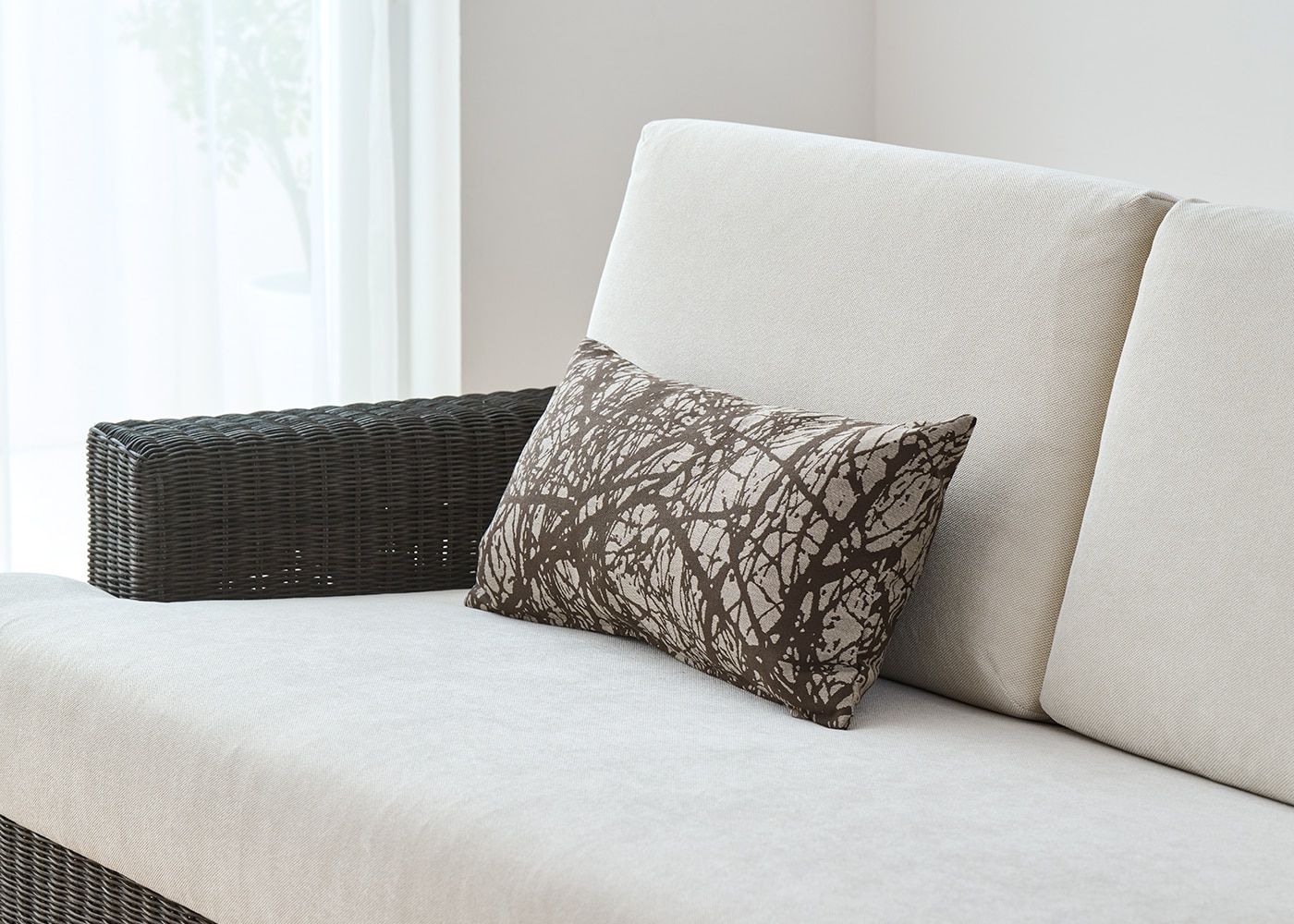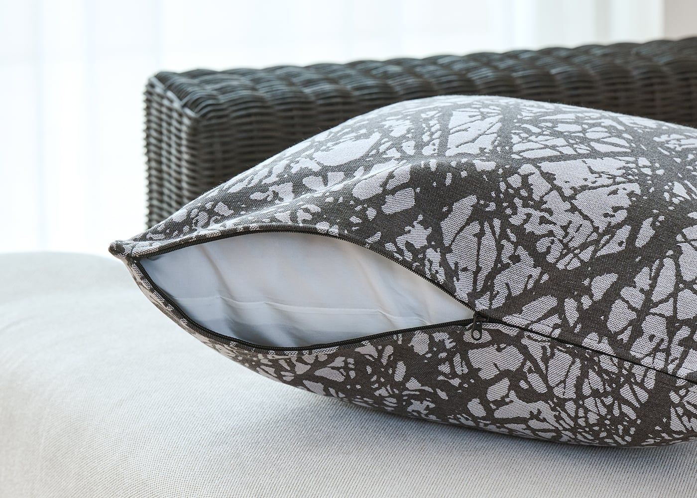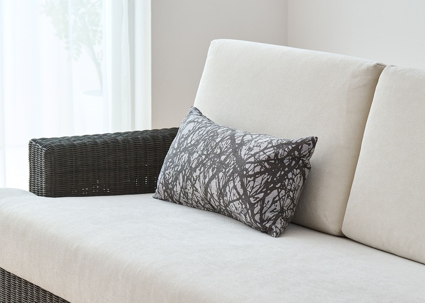 複雑でランダムな枝のラインを描いたデザインが魅力のウエストクッションカバー (ブランチ)。ソファなどの腰当てとしてご利用可能なウエストクッション(