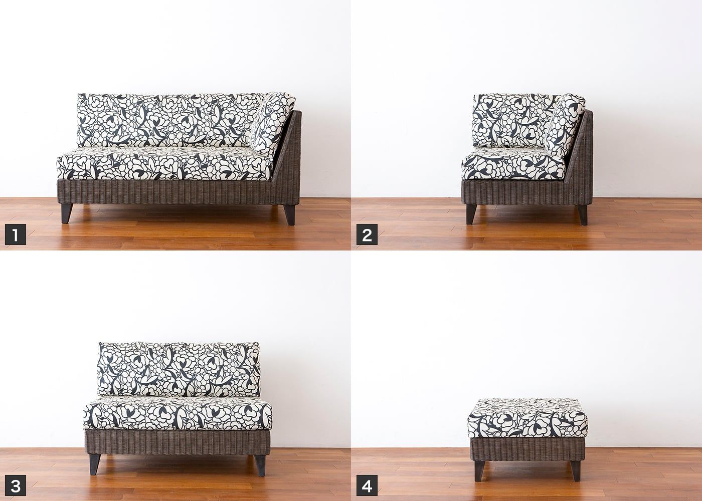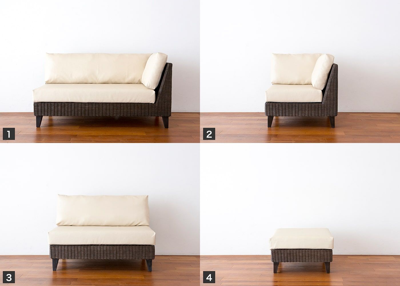 1.片アーム用、2.コーナー用、3.ベンチ用、4.オットマン用のセット例です。ショルダーレスト用もご用意しております。(※写真はPLダークベージュ)