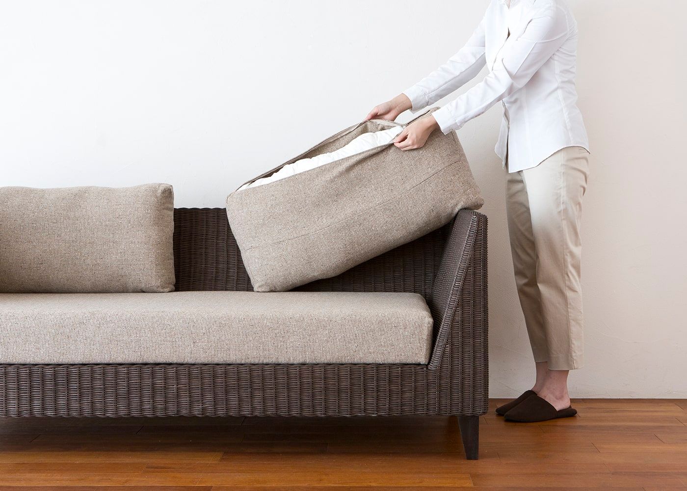 3種の糸を織り上げた、落ち着いた風合いと素材感が魅力のラン・コンパクトソファ(ラタン)カバー(プラノ)。3色のカラーバリエーションからお好みのカラーをお選びください。(※写真はPLアイボリー。両アーム用のセット例です)