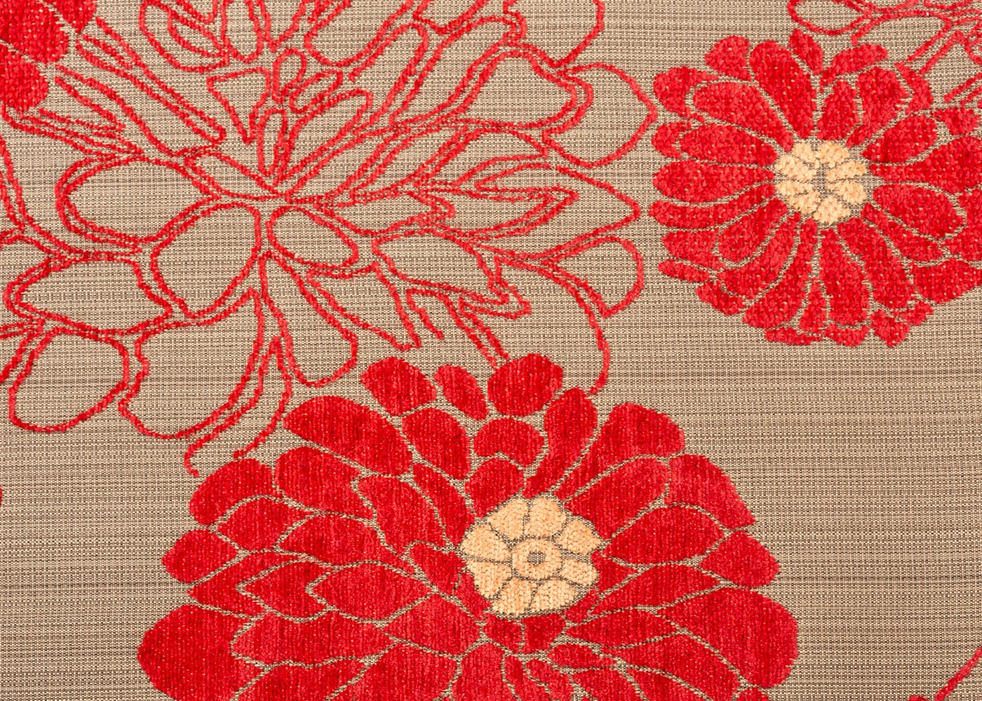 パウリナは、アジアを感じる「菊」をモチーフにしたa.flatオリジナルファブリックです。マットできめ細かなジャガード織りの上に、光沢のあるふっくらしたモール糸で花を大胆に描き、起毛させることで立体感のある表情豊かな生地に仕上げました。さらりとしつつも、やわらかな肌触りとボリューム感が魅力です。
