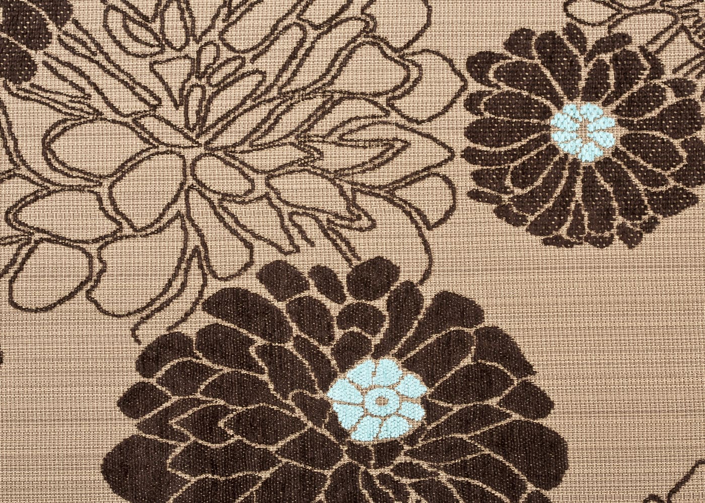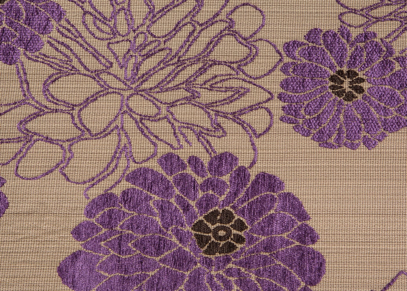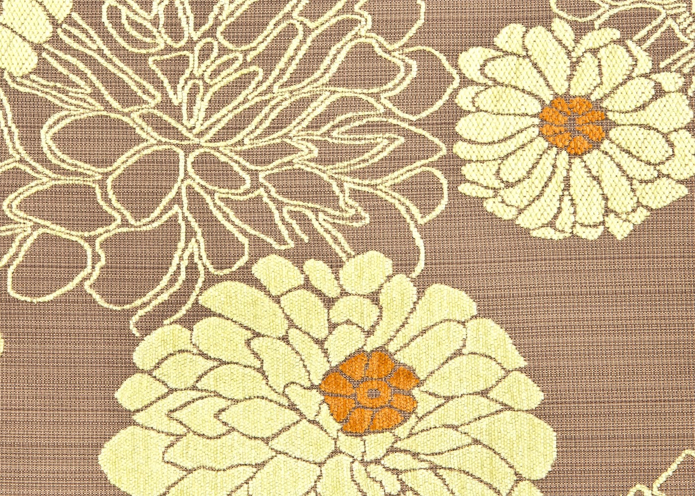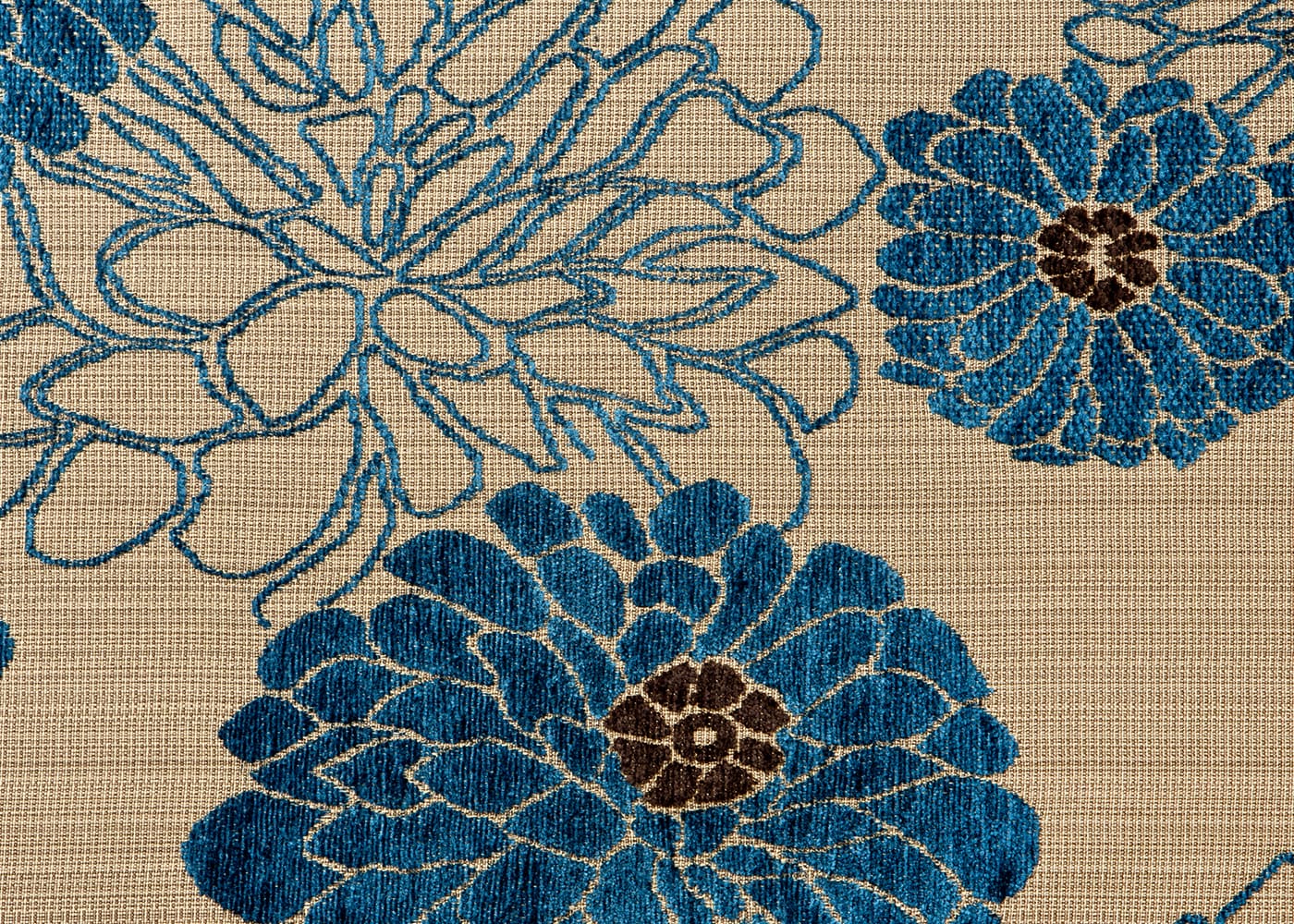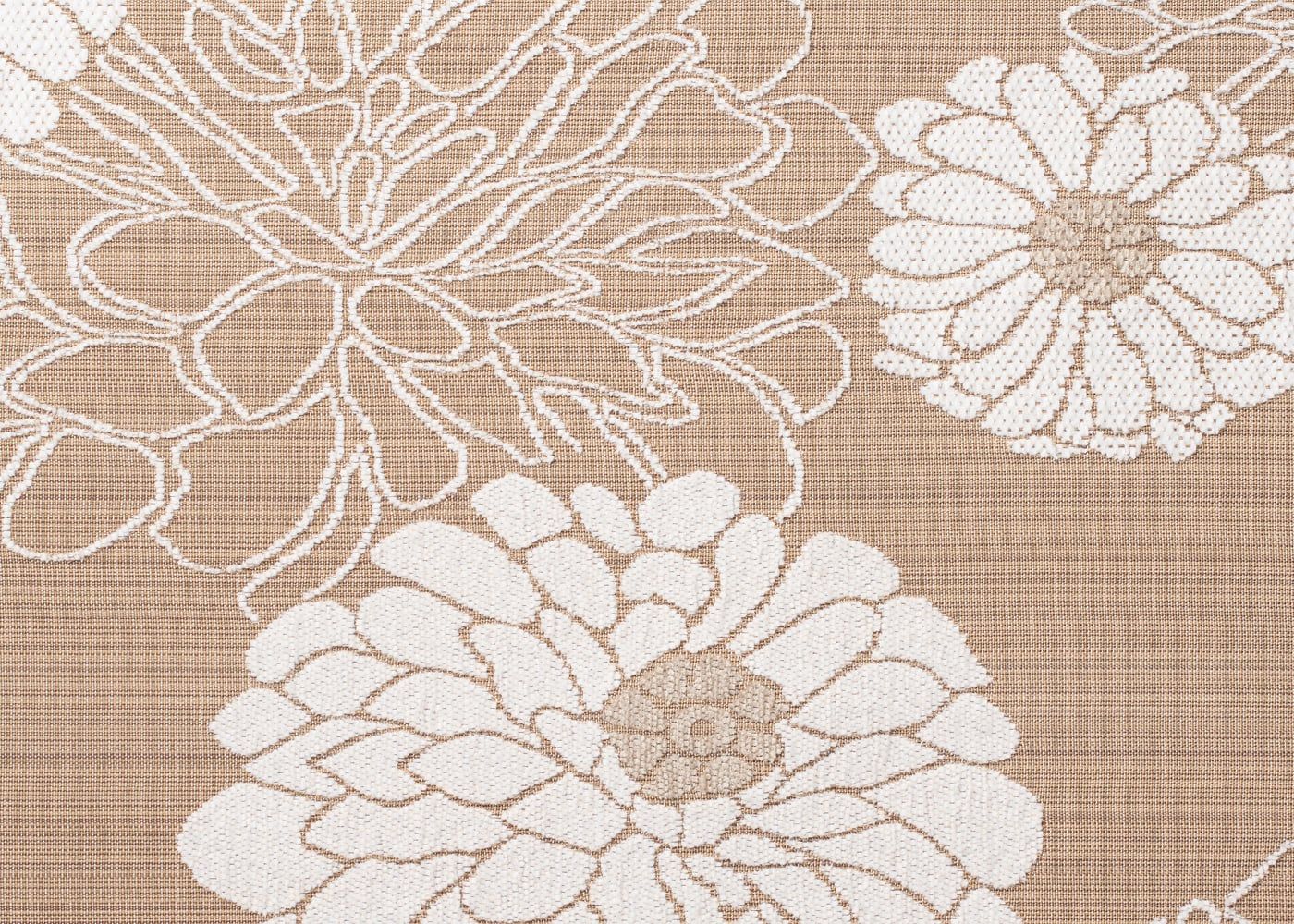 パウリナは、マットできめ細かなジャガード織りの上に、光沢のあるふっくらしたモール糸で花を大胆に描き、起毛させることで立体感のある表情豊かな生地に仕上げました。さらりとしつつも、やわらかな肌触りとボリューム感が魅力です。(写真はPUブラウン)