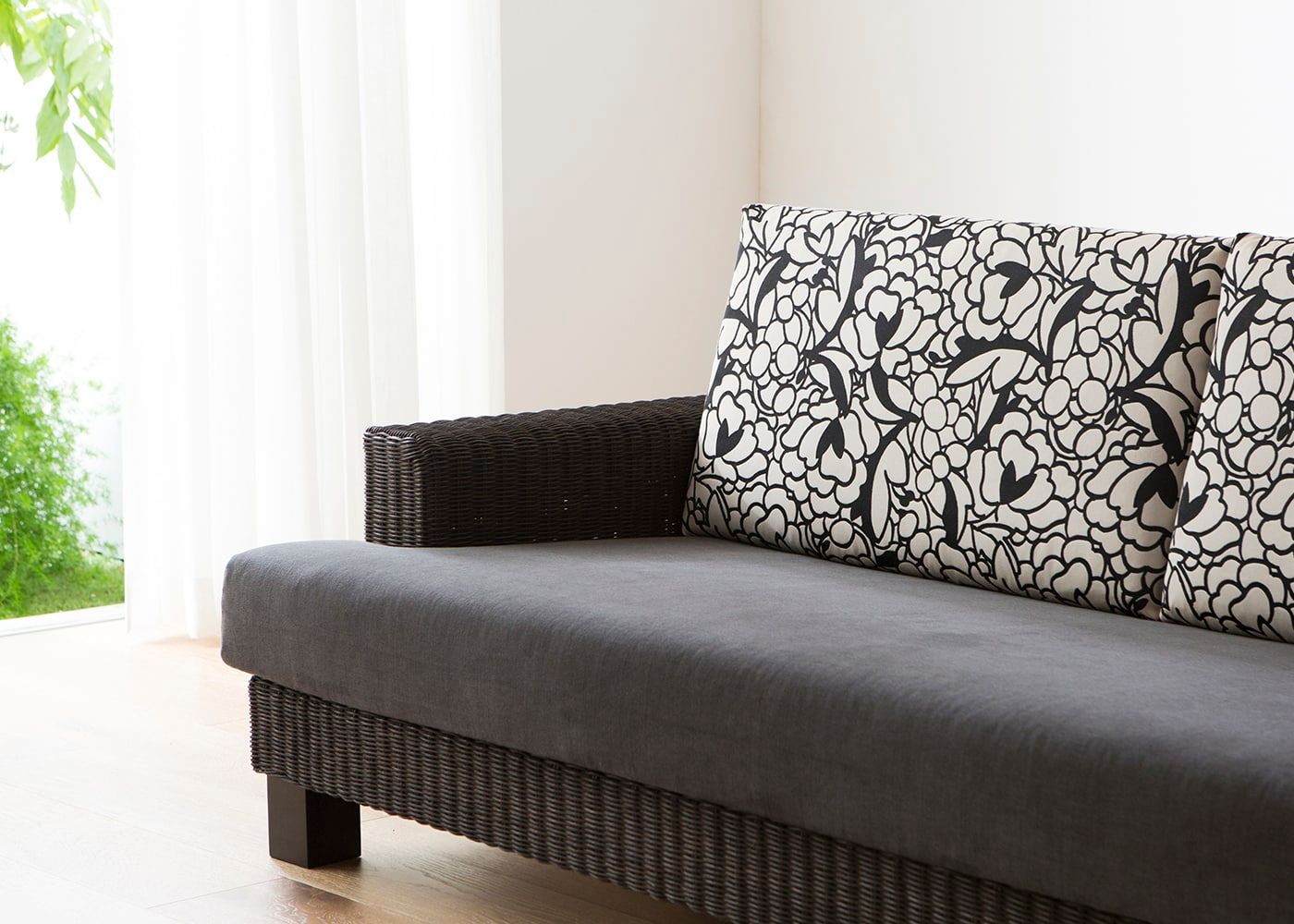 「湖水の華」をコンセプトにしたデザインが魅力のシン・ソファ (ラタン) カバー (コスイ)。コスイは花が広がる情景や生命の息吹をジャガード織りで表現した、滑らかでやさしい肌触りのファブリックです。(写真はKSベージュ + CLチャコール。2.5人掛け用のセット例です)