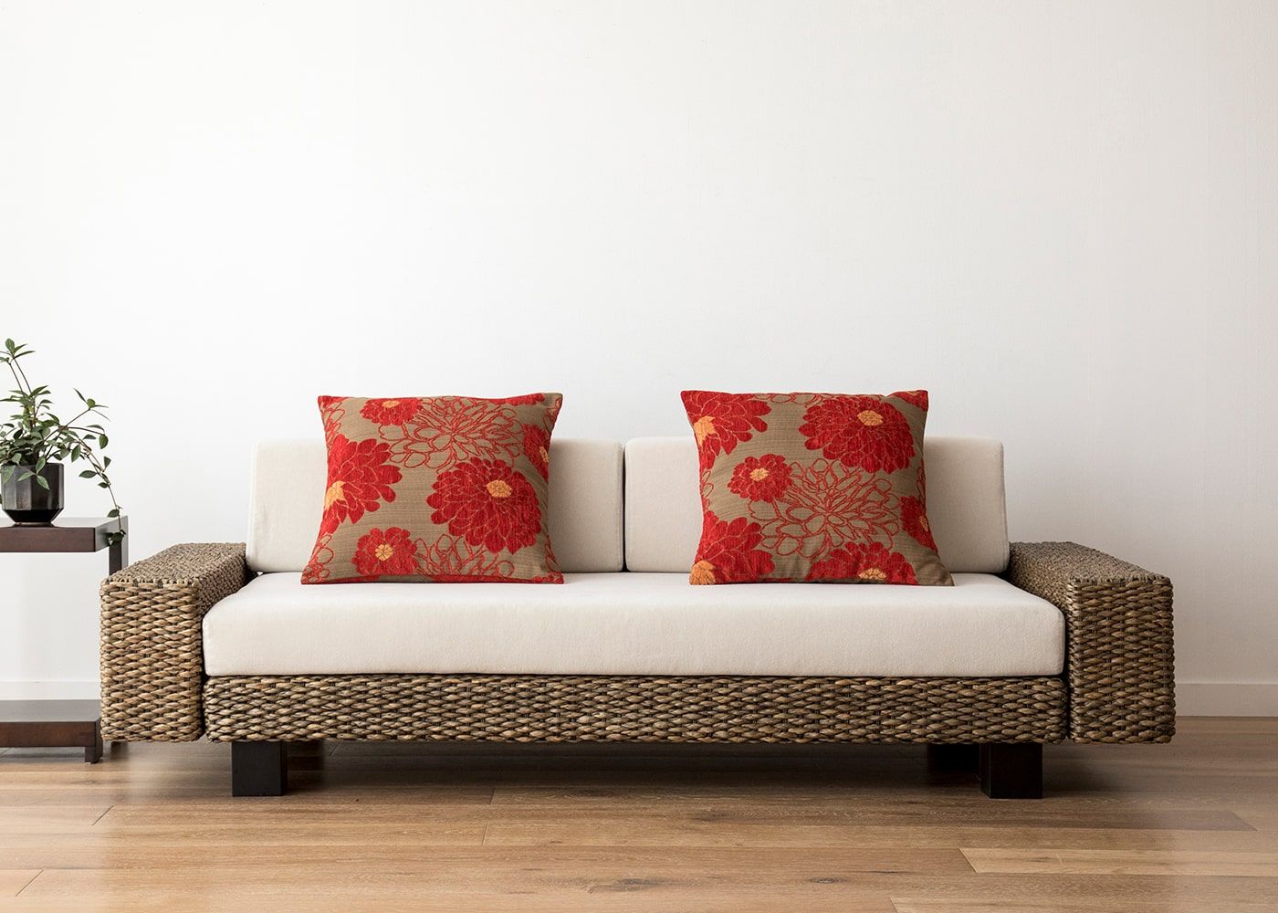 「菊」をモチーフにしたデザインが魅力のケイ・ローソファ(ヒヤシンス)カバー (パウリナ)。6色のバリエーションで、鮮やかさと落ち着きのある色合いをお楽しみいただけます。(写真はPUレッド。ボルスタークッション用×2のセット例です)