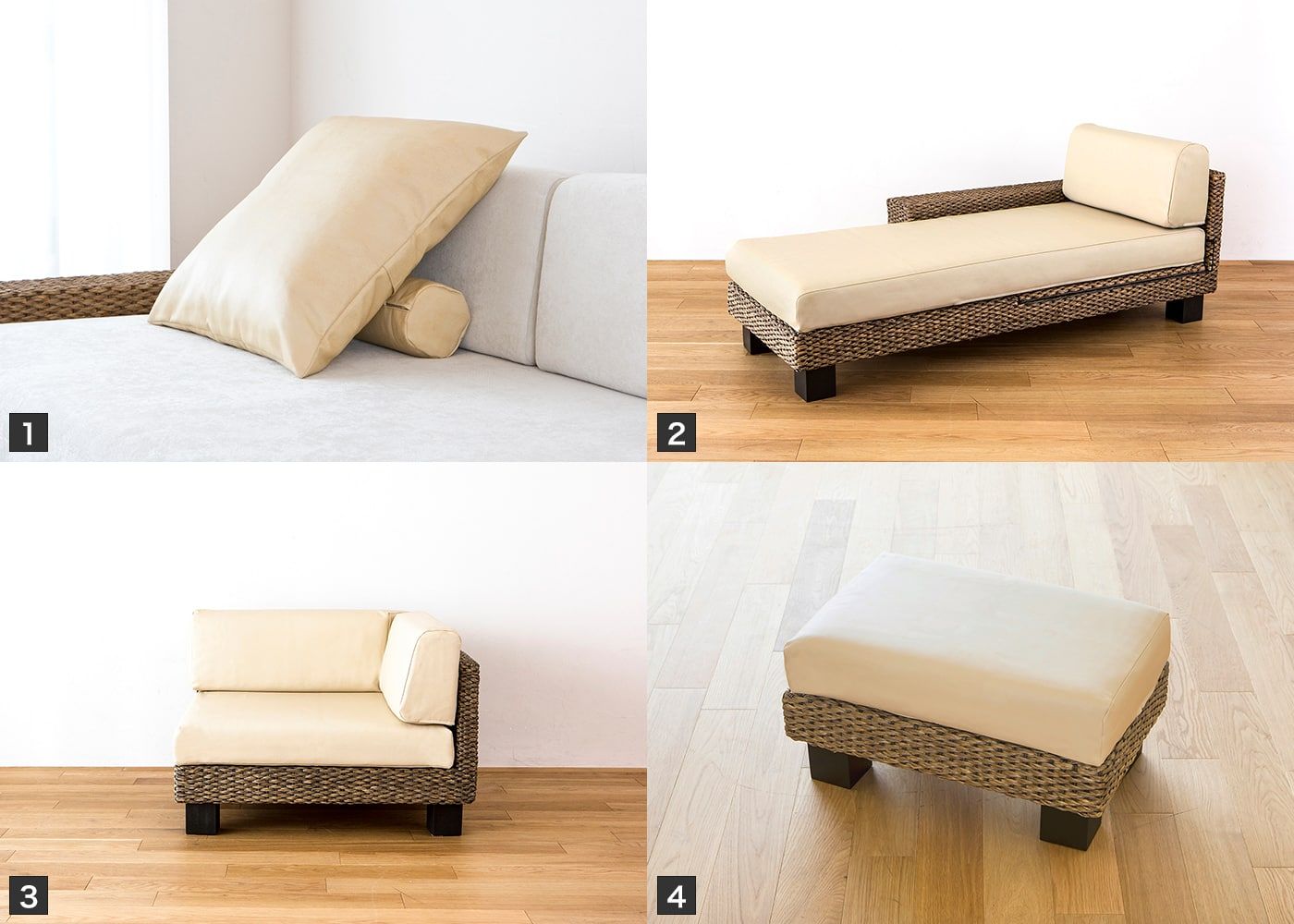 1→1.5人掛け用、2→2人掛け用、3→2.5人掛け用、4→3人掛け用のセット例です。(写真はSLアイボリー)