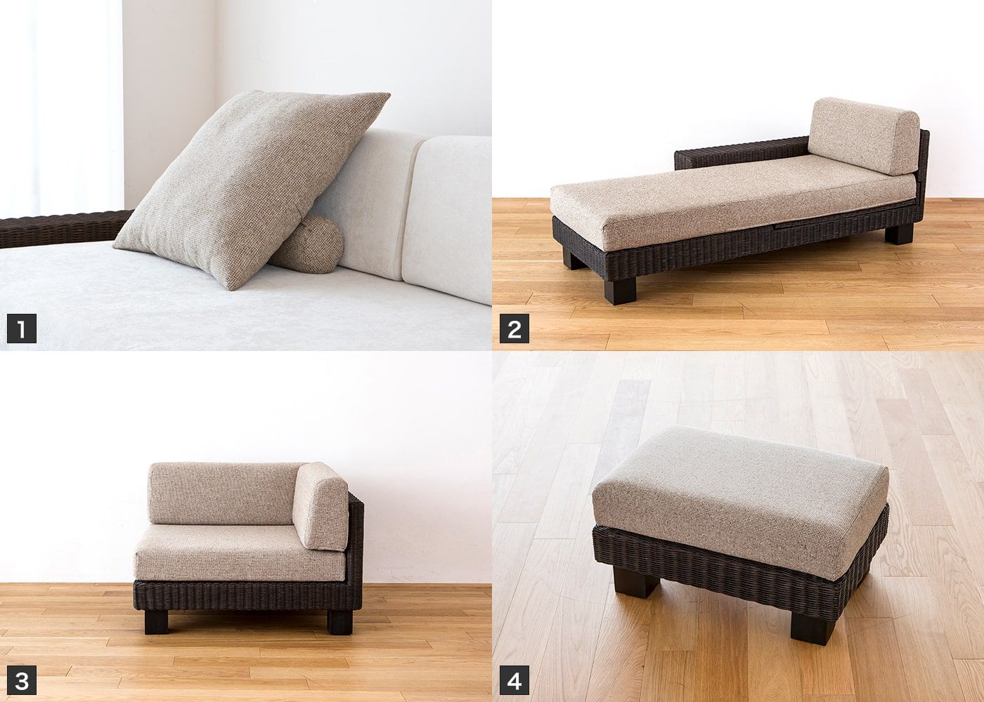 1→1.5人掛け用、2→2人掛け用、3→2.5人掛け用、4→3人掛け用のセット例です。(写真はPLダークベージュ)