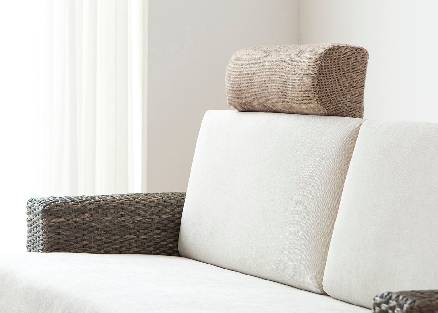プラノは、3種の糸で織り上げることで独自の素材感を生み出した日本製のファブリックです。ざっくりとした表情とコットンならではの柔らかさが調和した肌触りが特長。また、長く使える耐久性の高さも実現しました。コットンの吸湿発散性でオールシーズン使用できます。