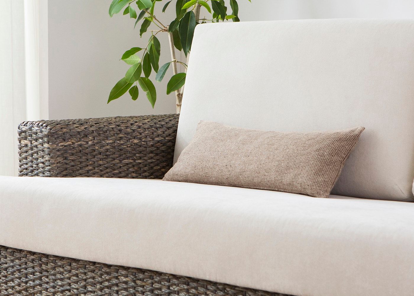 生地の風合いが引き立ち、クッションがインテリアの一部としてなじみます。(写真はPLダークベージュ)