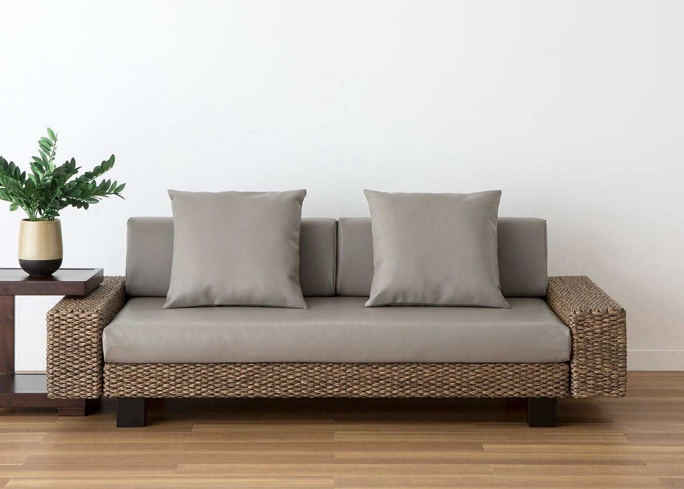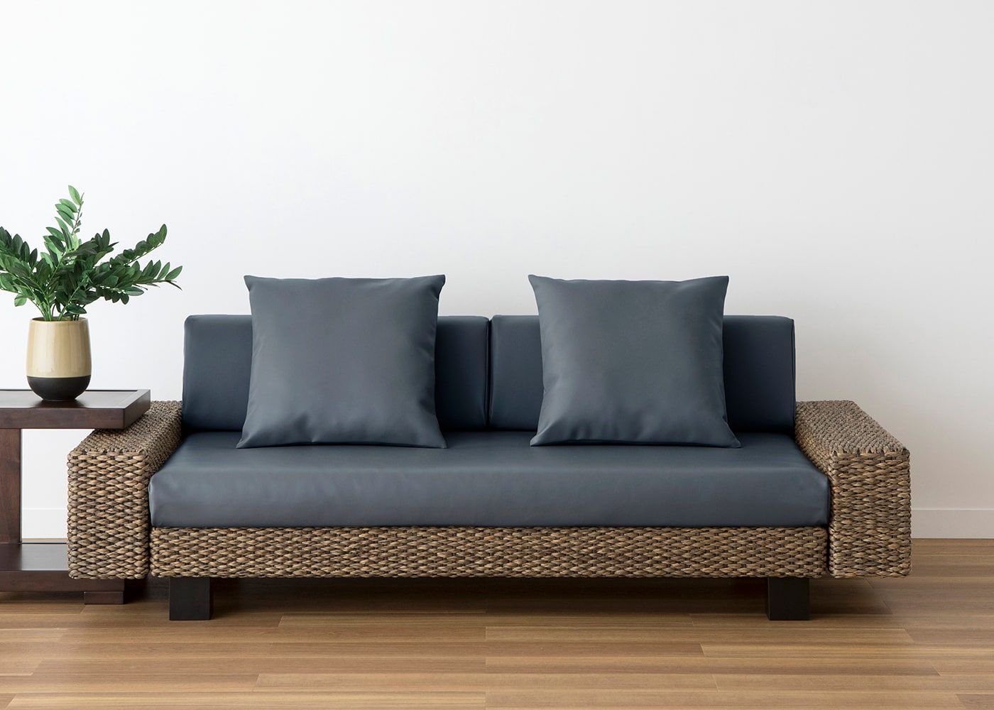 艶やかな本革の質感を表現した、しなやかで滑らかな肌触りが特長のケイ・ローソファ (ヒヤシンス) カバー (クリーンレザー)。上品な見た目とメンテナンスがしやすい機能性の高さを実現したファブリックです。(写真はCNチャコール。2.5人掛け用×1とボルスタークッション用×2のセット例です)
