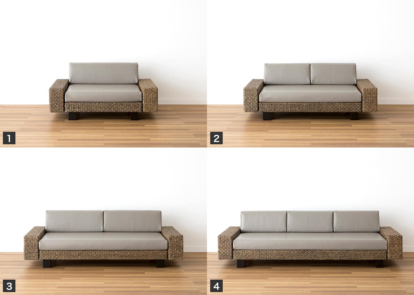 1:1.5人掛け用、2:2人掛け用、3:2.5人掛け用、4:3人掛け用のセット例です。(写真CNグレージュ)