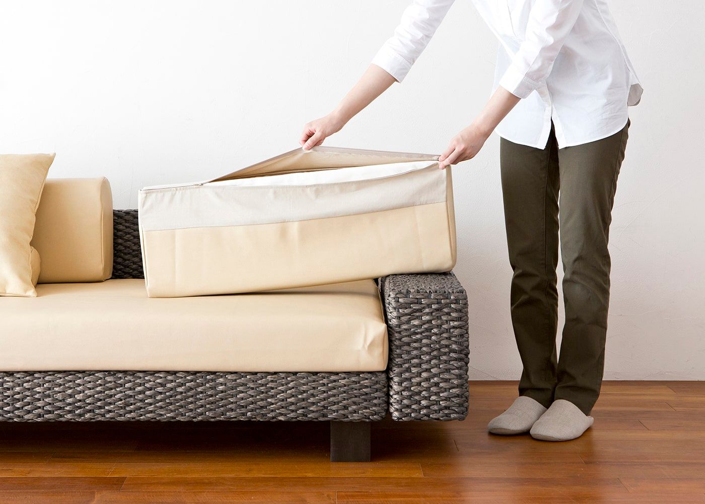 ファスナー式のため、簡単にカバー交換が可能。清潔感を保ちながら、気軽にお部屋の印象を変えることができます。