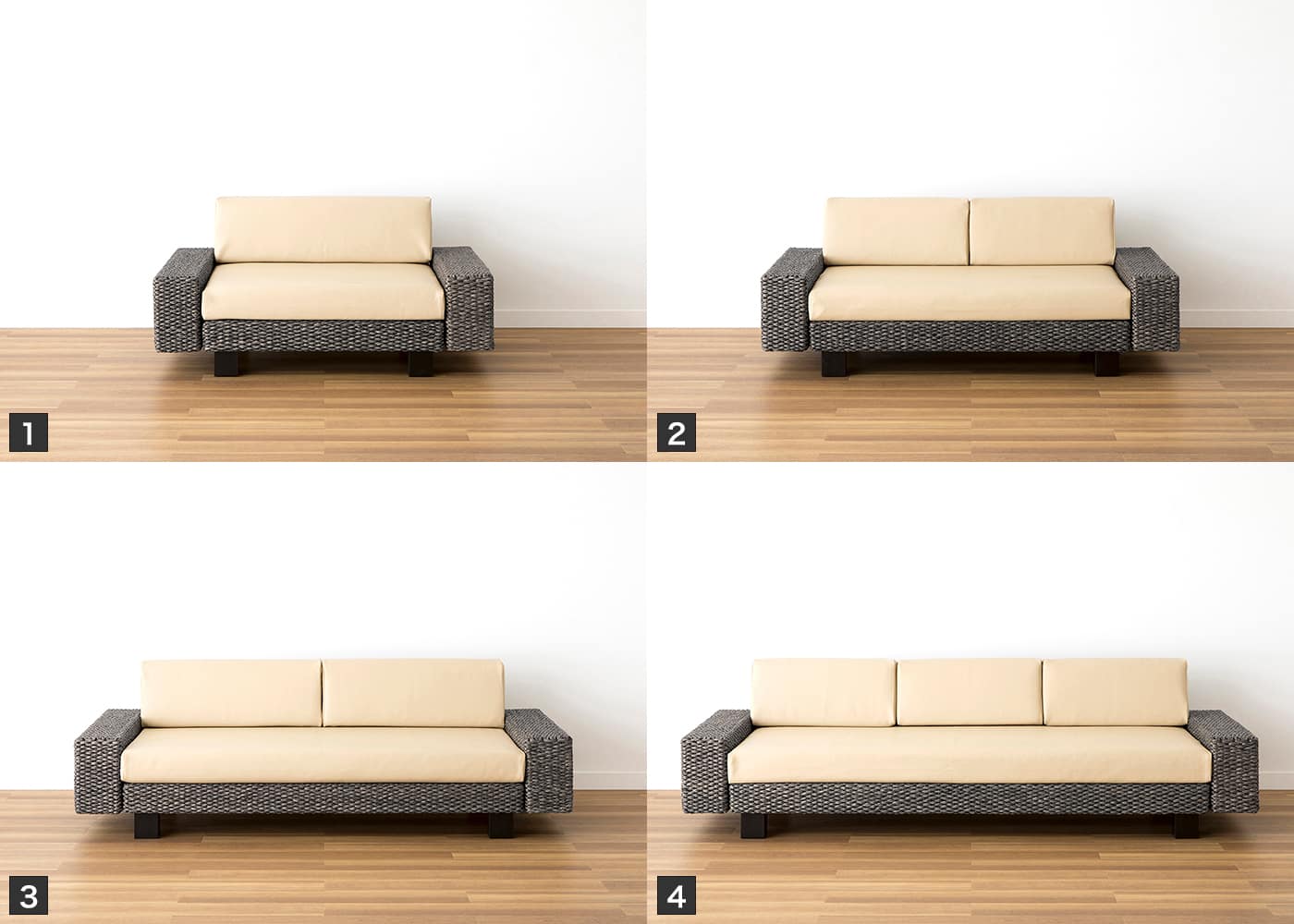 1→1.5人掛け用、2→2人掛け用、3→2.5人掛け用、4→3人掛け用のセット例です。(写真はSLアイボリー)