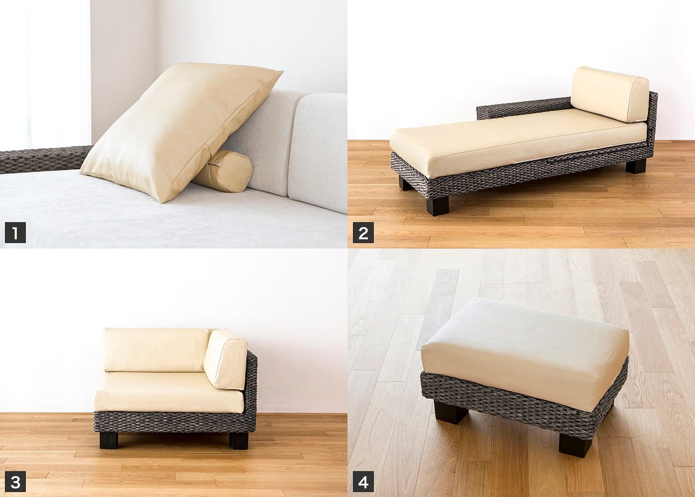 1:ボルスタークッション用、2:カウチ用、3:コーナー用、4:オットマン用のセット例です。(写真はSLアイボリー)