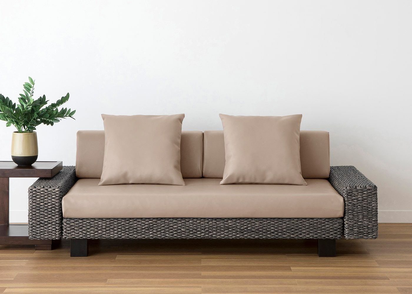 本革のような柔らかな風合いを表現した、しっとりとした肌触りが魅力のケイ・ローソファ (ヒヤシンスDG) カバー (ソフトレザーv02)。マットでやさしい素材感とメンテナンスがしやすい機能性を兼ね備えたファブリックです。(写真はSL2ダークベージュ。2.5人掛け用×1とボルスタークッション用×2のセット例です)