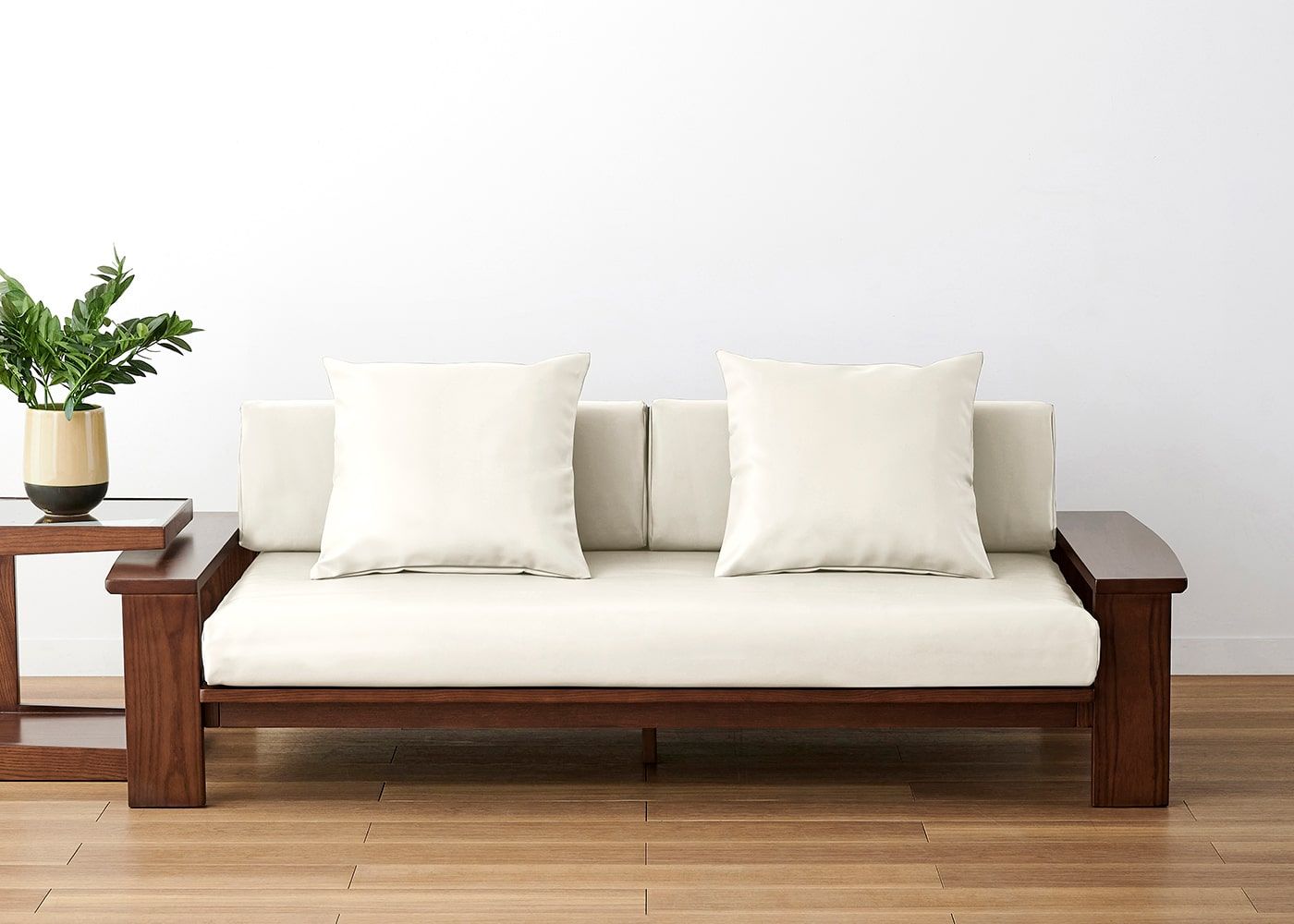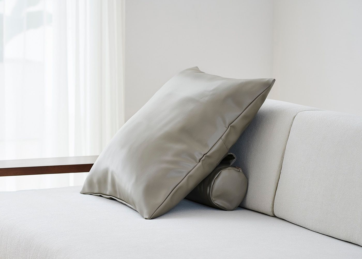 艶やかな本革の質感を表現した、しなやかで滑らかな肌触りが特長のセイル・ローソファ (GB) カバー (クリーンレザー)。上品な見た目とメンテナンスがしやすい機能性の高さを実現したファブリックです。(写真はCNオフホワイト。2.5人掛け用×1とボルスタークッション用×2のセット例です)