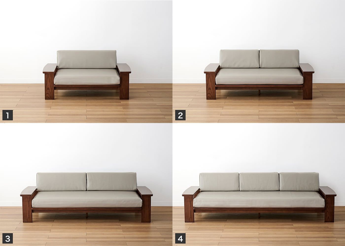 1→1.5人掛け用、2→2人掛け用、3→2.5人掛け用、4→3人掛け用のセット例です。(写真CNグレージュ)