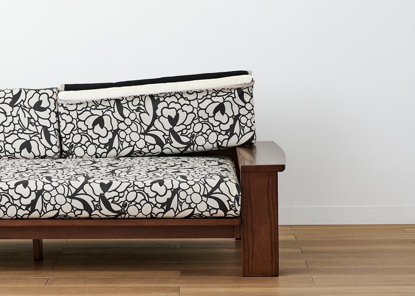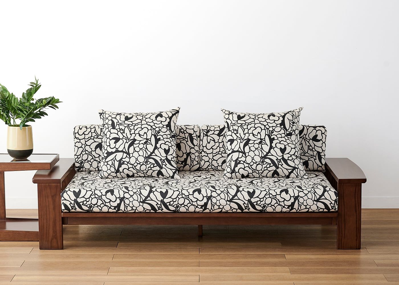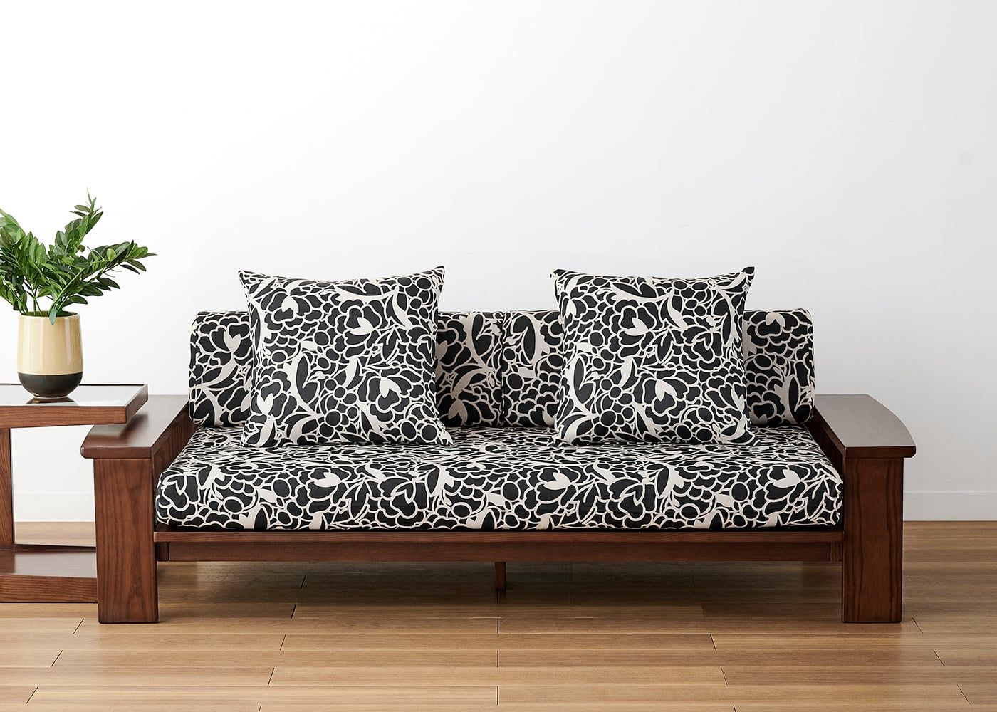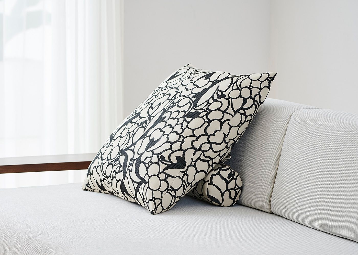 「湖水の華」をコンセプトにしたデザインが魅力のセイル・ローソファ (GB) カバー (コスイ)。コスイは花が広がる情景や生命の息吹をジャガード織りで表現した、滑らかでやさしい肌触りのファブリックです。(写真はKSブラック。2.5人掛け用×1とボルスタークッション用×2のセット例です)