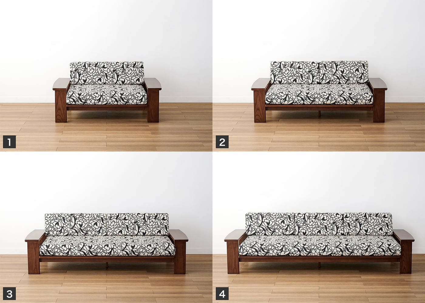 1→1.5人掛け用、2→2人掛け用、3→2.5人掛け用、4→3人掛け用のセット例です。(写真はKSベージュ)