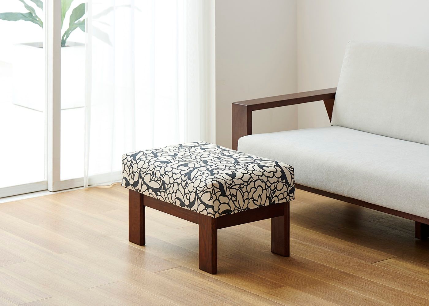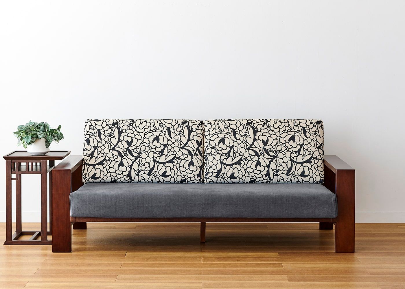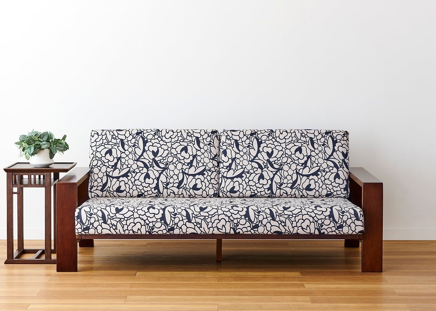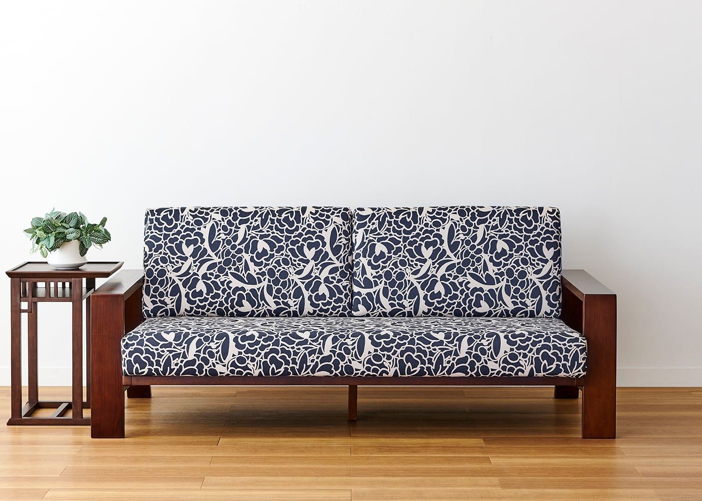 「湖水の華」をコンセプトにしたデザインが魅力のウッド・ソファv02カバー (コスイ)。総花柄とツートンの計4色のカラーバリエーションからお好みのカラーをお選びください。
