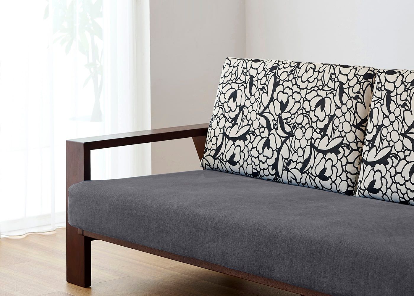 「湖水の華」をコンセプトにしたデザインが魅力のウッド・ソファv02カバー (コスイ)。コスイは花が広がる情景や生命の息吹をジャガード織りで表現した、滑らかでやさしい肌触りのファブリックです。(写真は2.5人掛け。KSベージュ+CLチャコール)