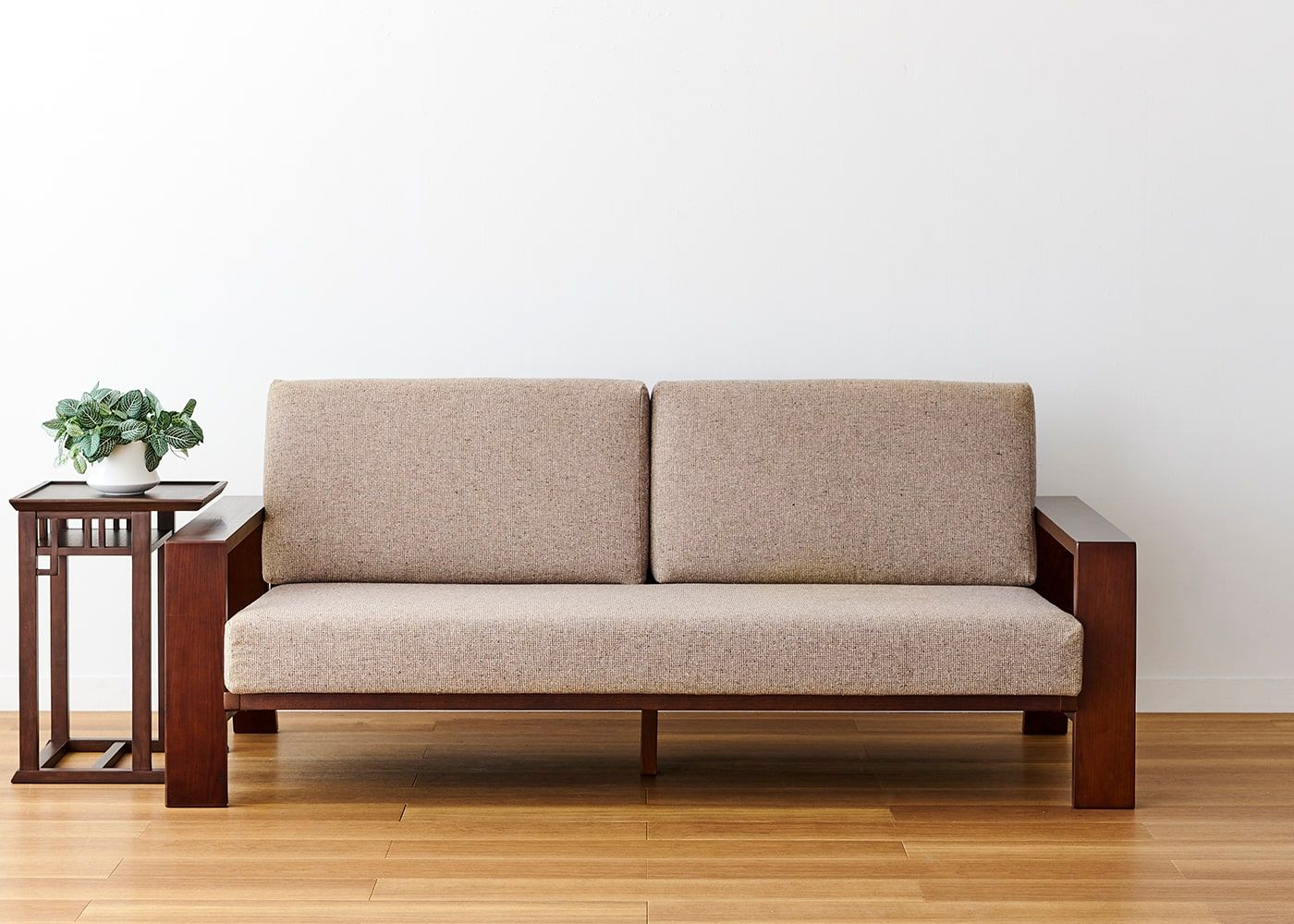 複数の糸で織り上げることで独自の素材感を生み出した日本製のファブリックであるウッド・ソファv02カバー(プラノ)。温かみのある3色からお好きな色をお選びください。(写真はPLダークベージュ。2.5人掛け用のセット例です)