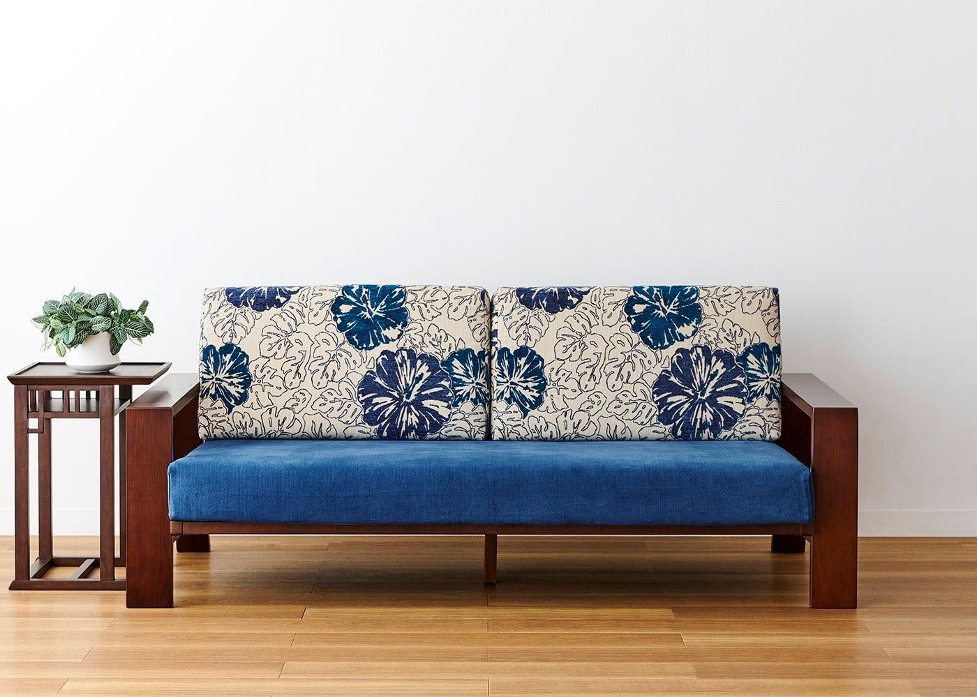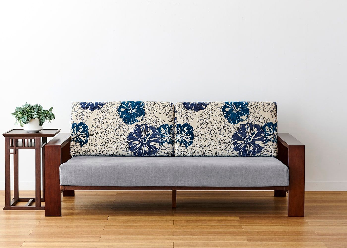 リゾート地に大きく大胆に咲き誇る、ハイビスカスのデザインが魅力のウッド・ソファv02カバー (ハイビスカス)。島々の1日のうつろいや自然の情景を描いた非日常感のあるソファカバーです。背面はブルーとパープルの2色展開、座面は相性が良い数色からお選びください。(写真は2.5人掛け。HBブルー+CLブルー)