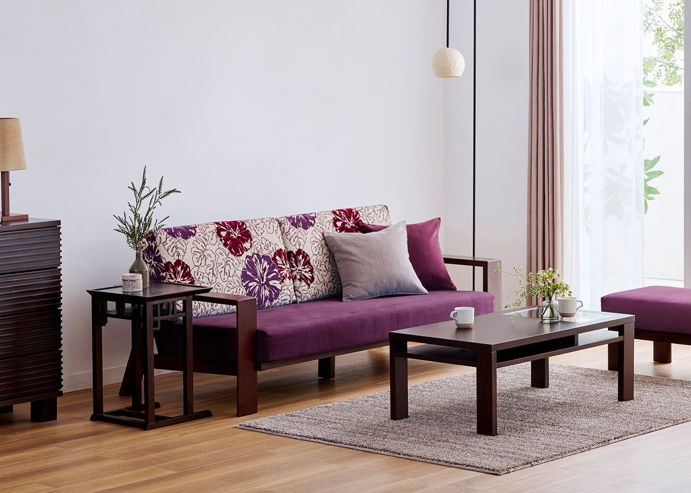 ウッド・ソファv02カバー (ハイビスカス)を主役にしたカラーコーディネート例です。パープルのハイビスカス柄のソファカバーと合わせたクッションカバーなどで彩れば、洗練されたリゾートホテルのようなリビングを演出できます。(写真のソファは2.5人掛け。ソファカバーはHBパープル+ORパープル)