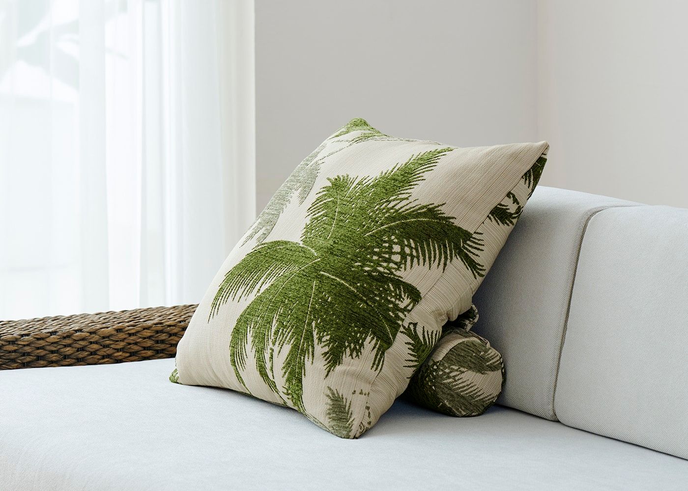南国を連想させるヤシの大胆なデザインが魅力のケイ・ローソファ (ヒヤシンス) カバー (パーム)。光沢のあるふっくらしたモール糸で葉の細かい部分まで描いた表情豊かなファブリックです。(写真はPRグリーン。ボルスタークッション用×2のセット例です)