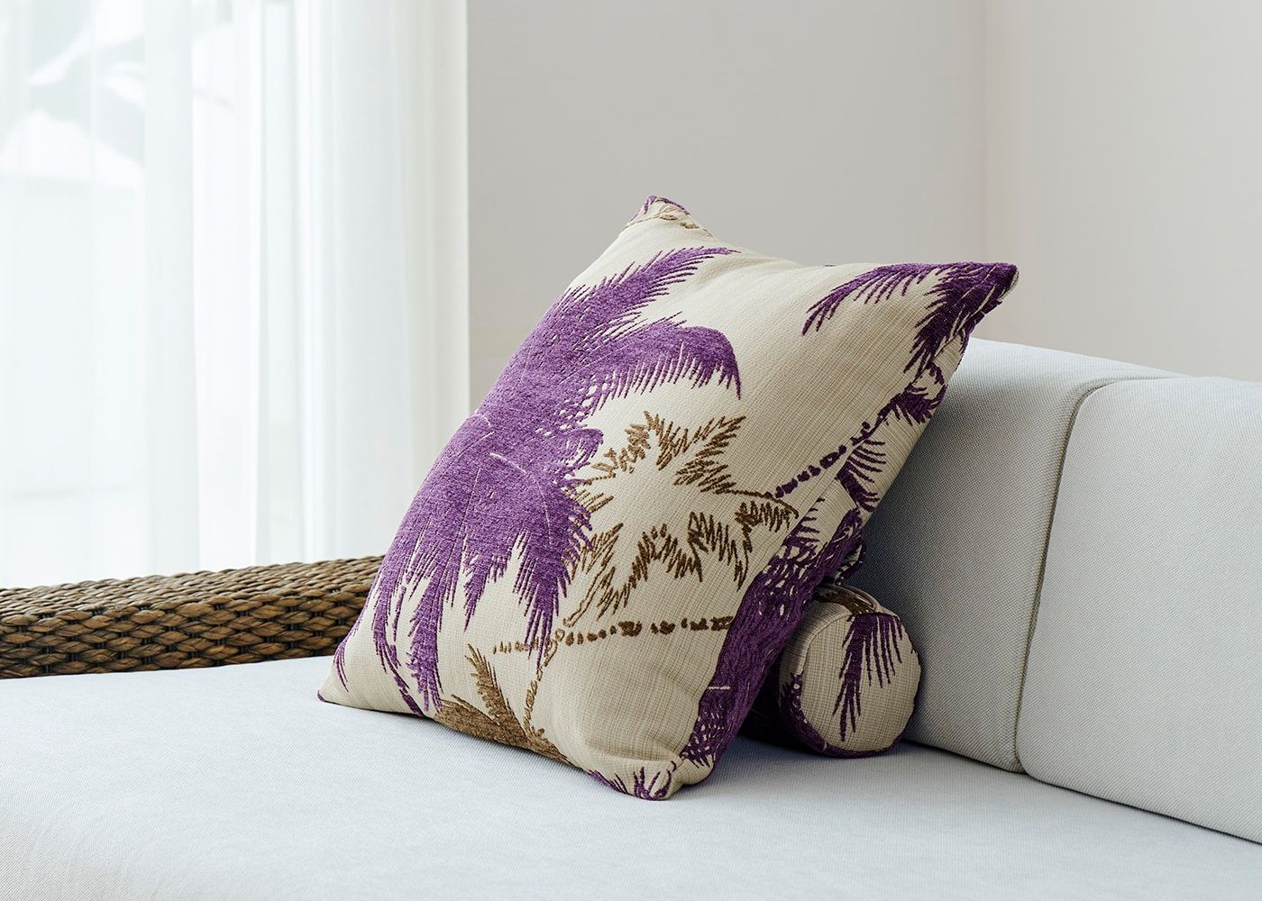 鮮やかな発色のモール糸を用い、夕暮れ時にそびえるヤシの大胆で迫力ある情景を表現。柄部分はふんわりとした触り心地で、感触の違いもお楽しみいただけます。(写真はPRパープル)