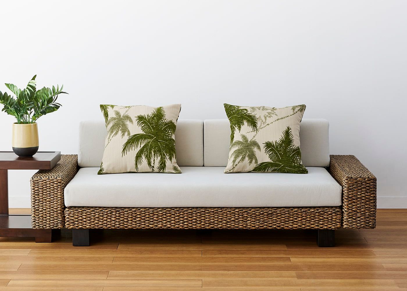 南国リゾートを連想させるヤシの大胆なデザインが魅力のケイ・ローソファ (ヒヤシンス) カバー (パーム)。マットできめ細かなジャガード織りの上に、光沢のあるふっくらしたモール糸で花を大胆に描いた表情豊かなファブリックです。2色のカラーバリエーションからお好みのカラーをお選びください。