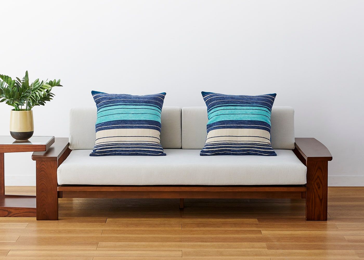 ハワイの島々をイメージした部屋作りが叶う、セイル・ローソファ×ブルーのコーディネ-ト例。ミストブルーのソファカバーに、ILブルー・ORターコイズPMホワイトのクッションを組み合わせて、美しいリゾートの情景を再現してみましょう。≫アイランドカラーズ【デイタイムブルー編-1】の画像を一覧で見る