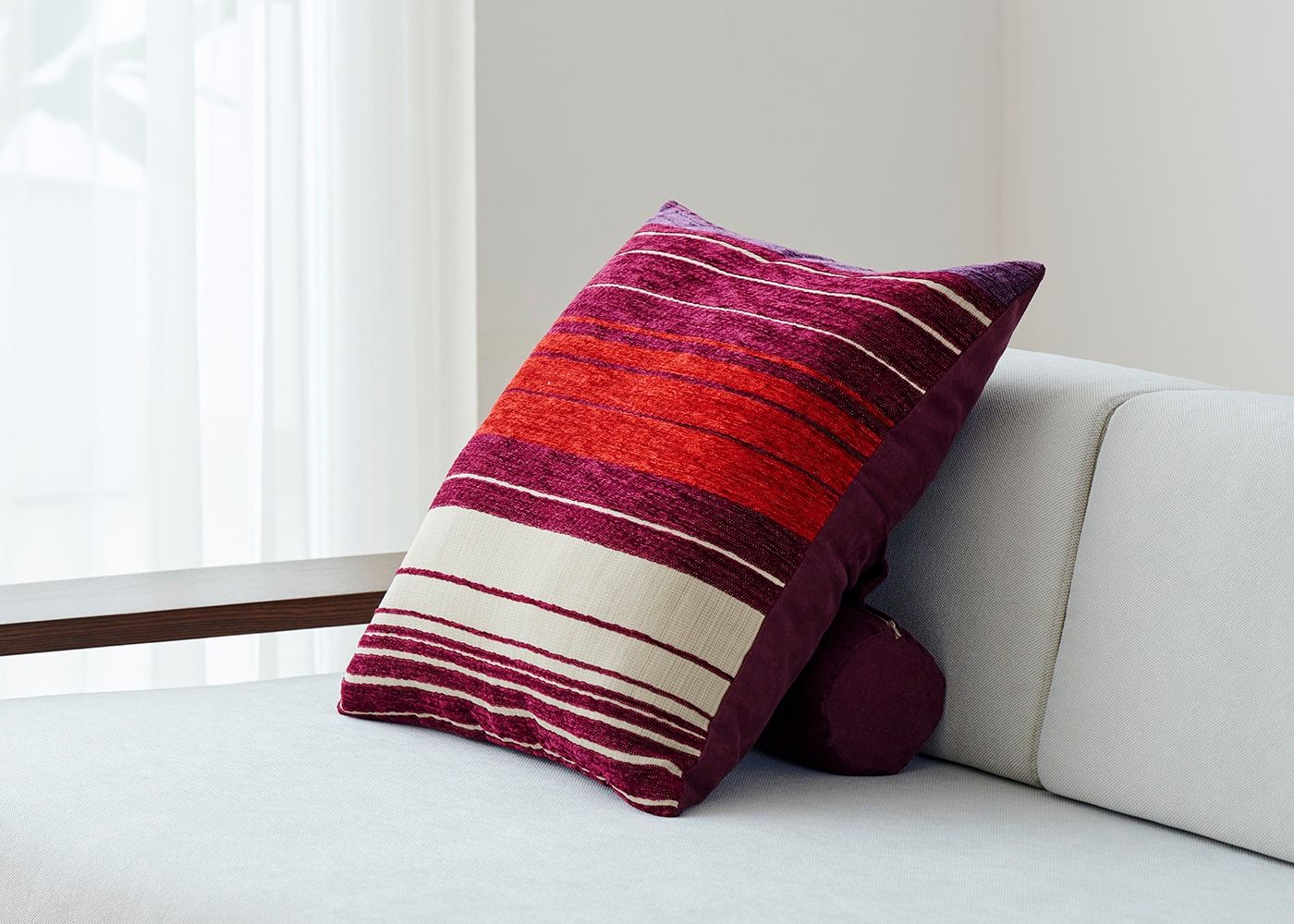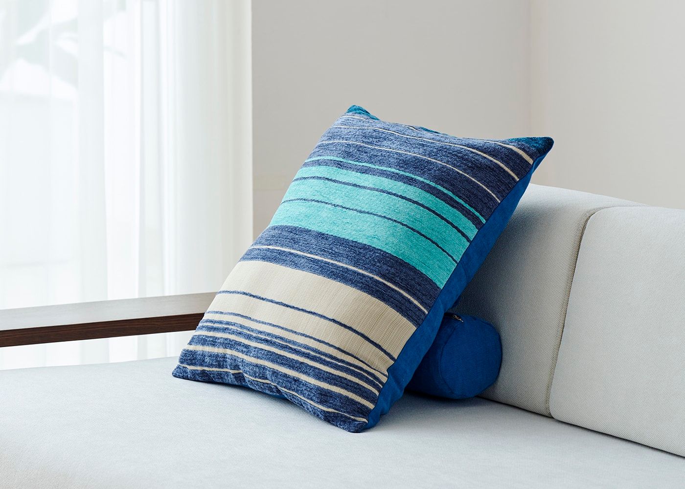 ボルスタークッションカバーは1枚から購入が可能。ボルスタークッションカバーは1枚から購入が可能。開放感を感じさせる柄と、心地よい肌ざわりにこだわり、お部屋の彩りとしてお使いいただけます。(写真はILブルー)