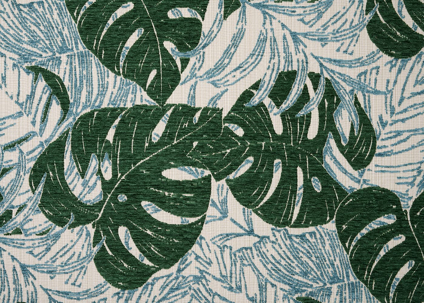 リゾート感のあるモンステラ柄を引き立たせたツートンデザインです。背面はマットできめ細かなジャガード織りの上に、光沢のあるふっくらしたモール糸でモンステラ柄を大胆に描いた表情豊かなファブリックとなります。座面は上質な無地のファブリック (カレイド)を用いました。(写真はMSグリーン+CLシン)