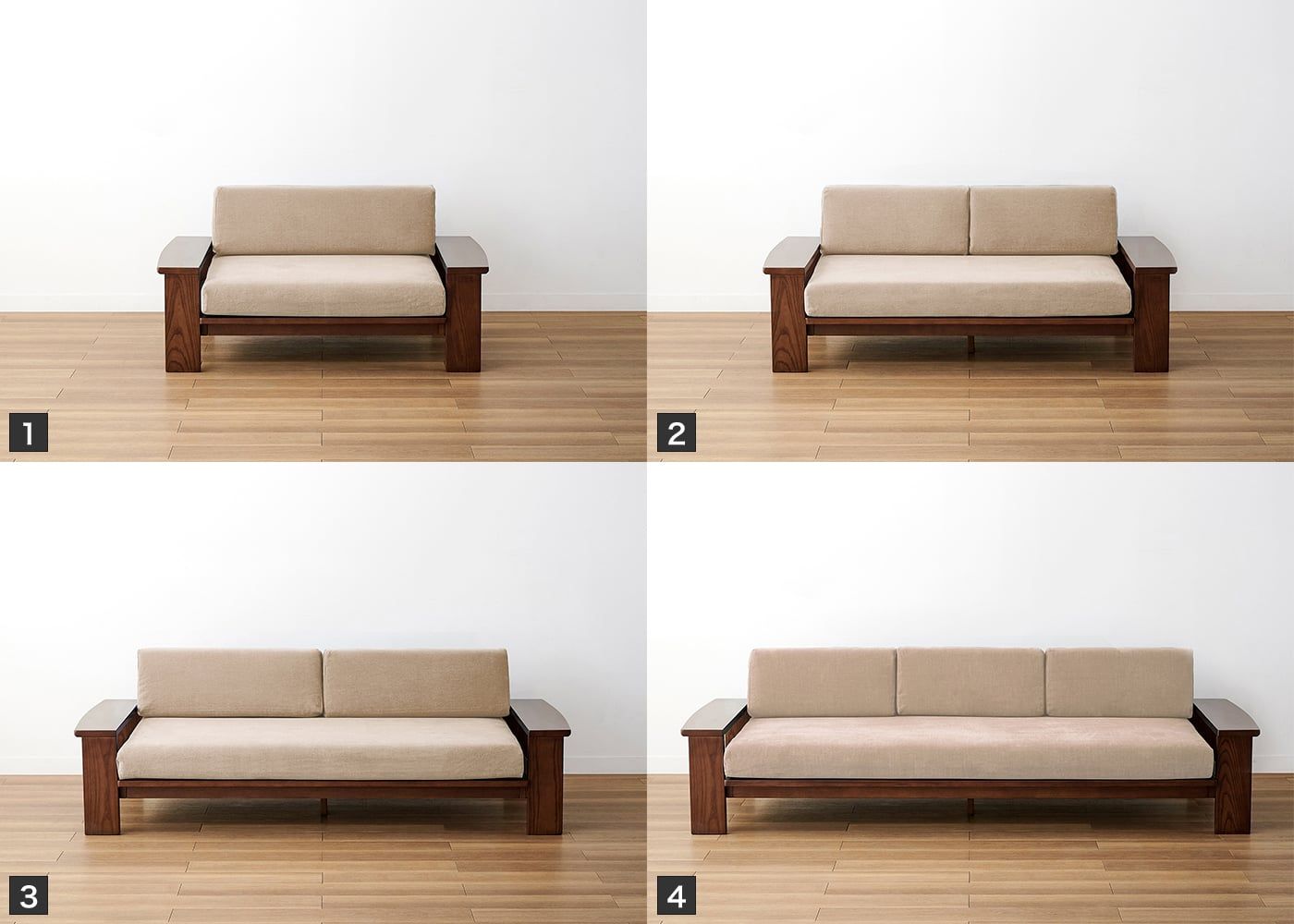 1→1.5人掛け用、2→2人掛け用、3→2.5人掛け用、4→3人掛け用のセット例です。(写真はMDベージュ)
