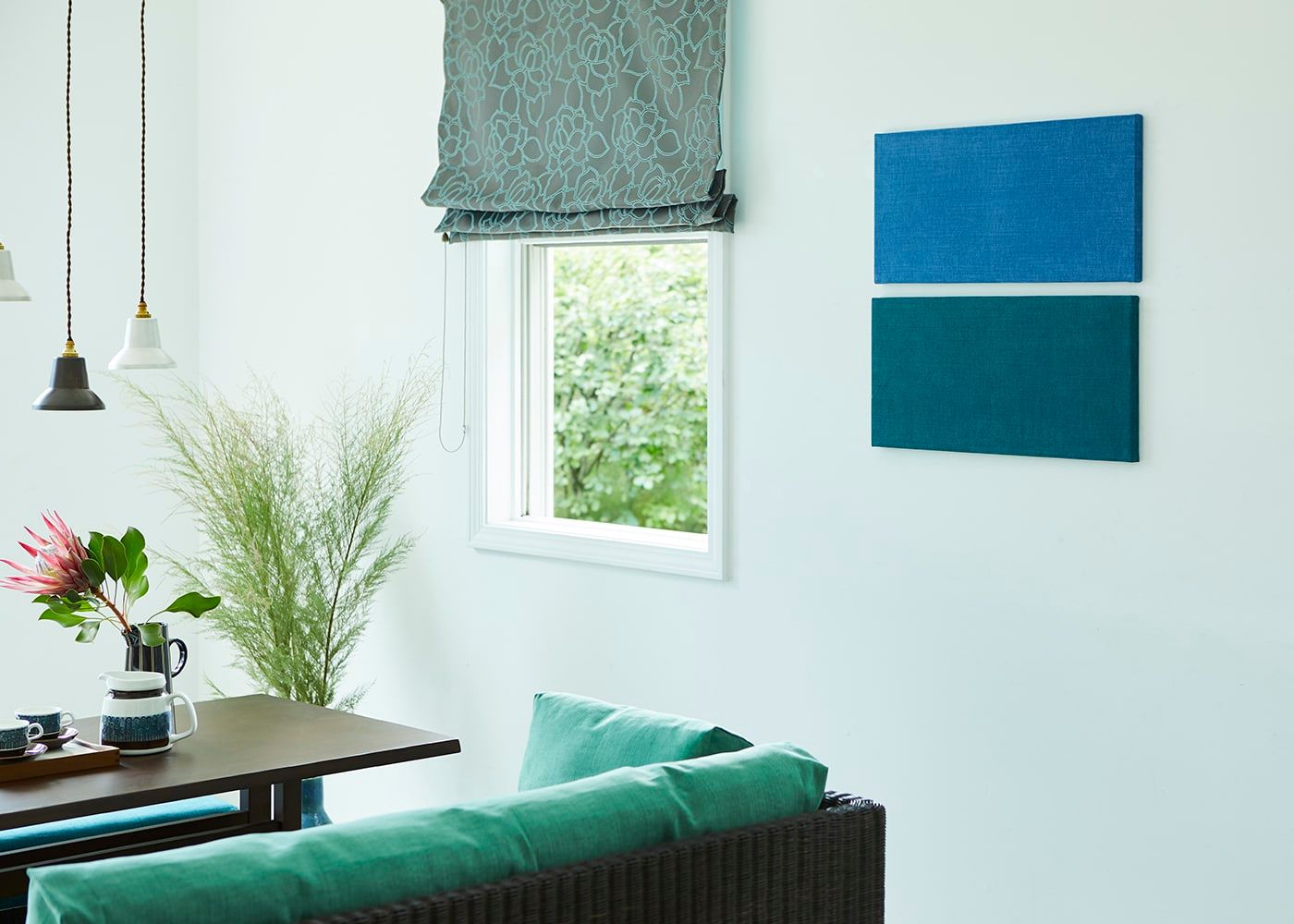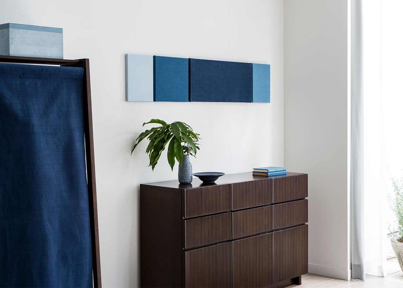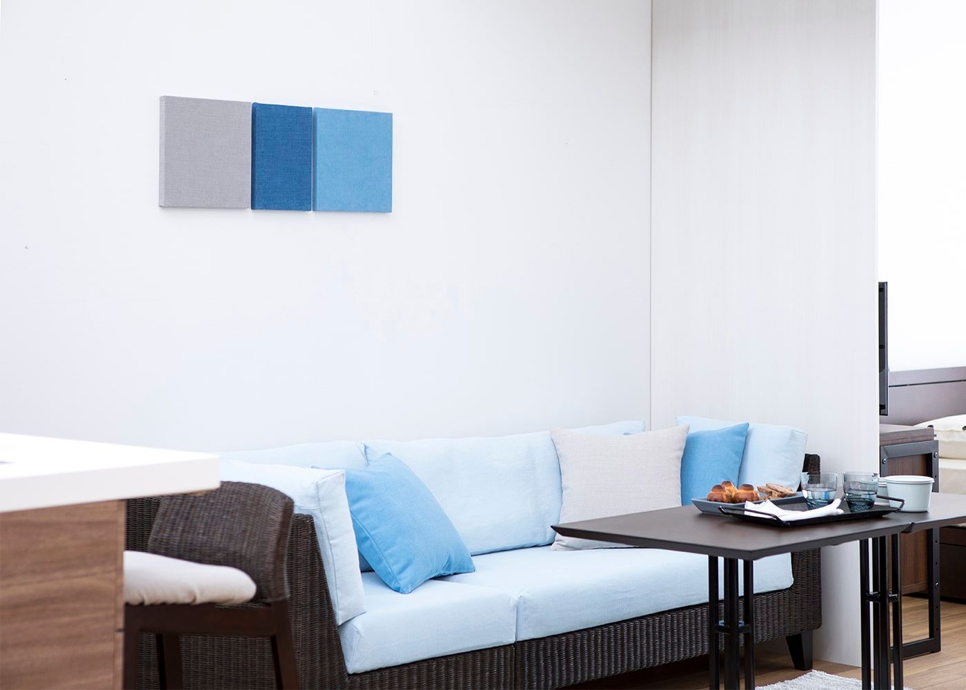 リゾートで見る青空や大海原が映し出す、美しいブルーの移ろいを描いたファブリックパネル (シーサイドブルー)。