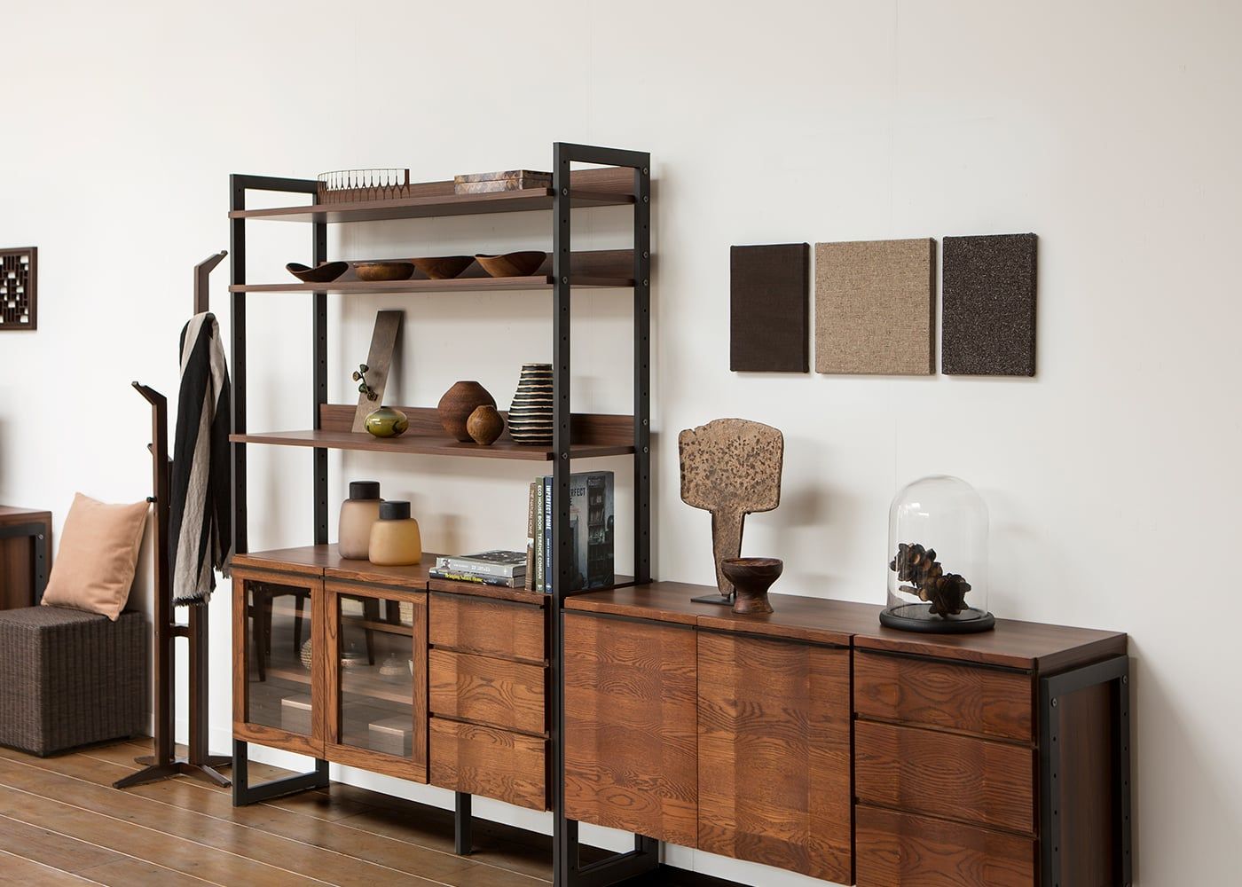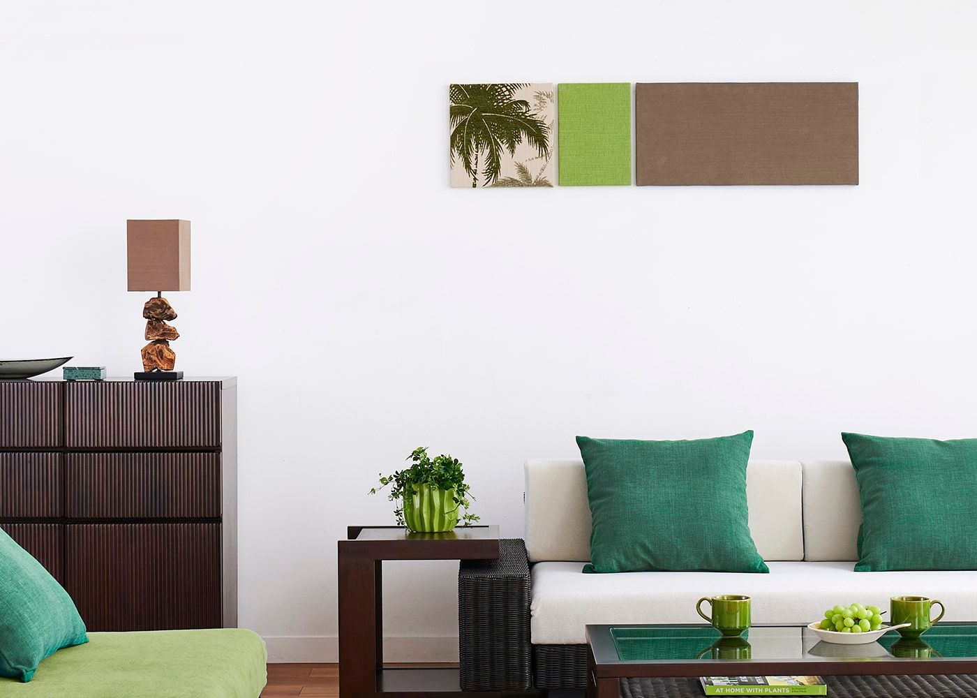 リラックス感のあるグリーンが主役のリビングコーディネート例。グリーンのみでカラーをまとめると目立ち過ぎるため、ブラウンのパネルを加えて配色に落ち着きを持たせています。(写真は左から、