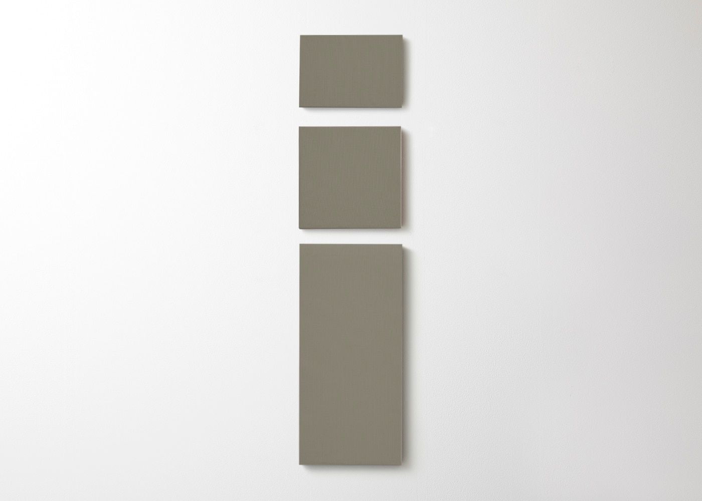キャビネットをコーナーに置いた山なりの見え方に合わせる時は、パネルを縦にレイアウトすることで高さのアクセントが付けられます。(写真は上から、PLダークベージュ 300×300タイプ、