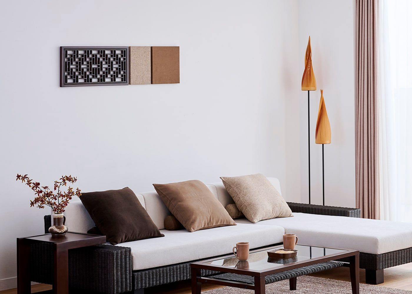 カウチソファ周辺をブラウンで統一したコーディネート例。クッションとパネルの色合いを揃えることで、おしゃれな雰囲気が演出できます。(写真は左から、