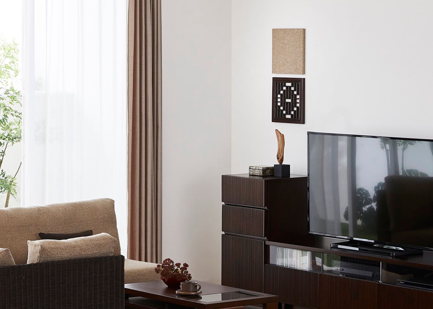 テレビボードの上にフォーカルポイントを作ったコーディネート例。無機質になりがちなテレビの周りに壁面装飾を添えることで、インテリア性を格段にアップできます。(写真は上から、CLブラウンオーク 300×300タイプ、