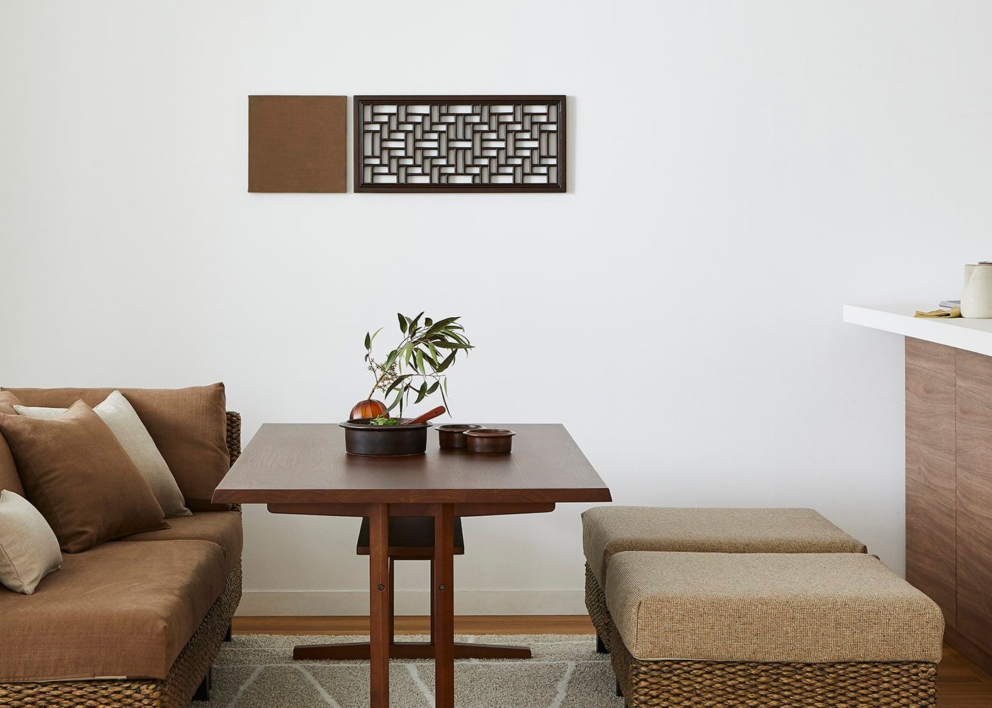 ソファダイニング空間に、ファブリックパネルをプラスしたコーディネート例。ファブリックパネルがウッドパネルを引き立てるパターンも組み合わせの一つです。(写真は左から、CLブラウンオーク 300×300タイプ、